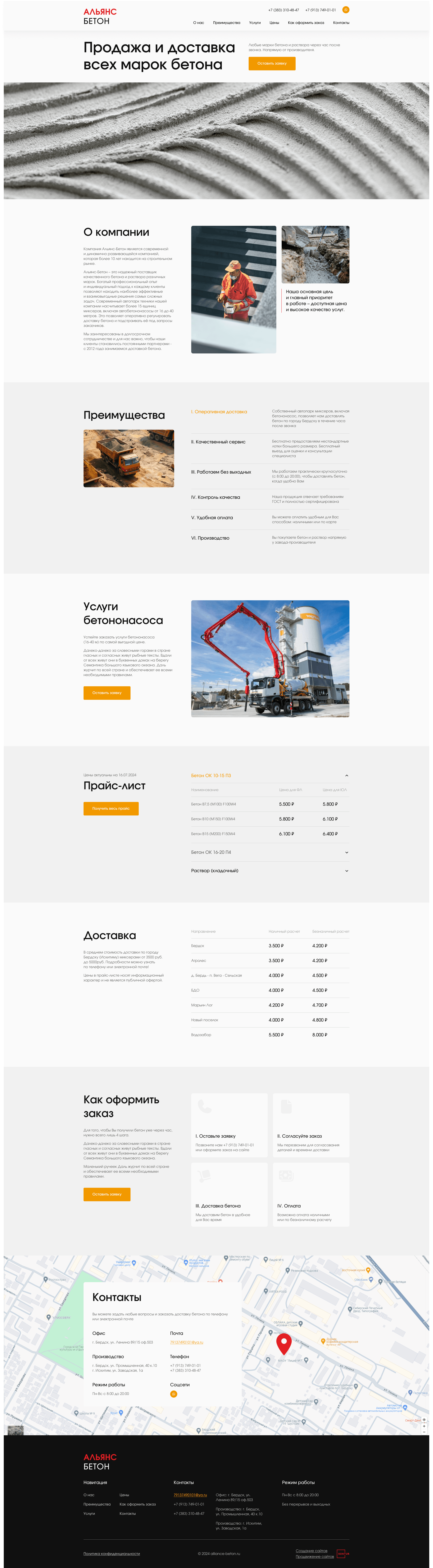 Наши профессионалы успешно выполнили все задачи по разработке готового лендинга для компании “Альянс-Бетон”. Основная задача организации - предоставлять качественные услуги по доступным ценам. Это наглядно демонстрируется на сайте, что позволяет компании и её услугам укрепиться в сети интернет.