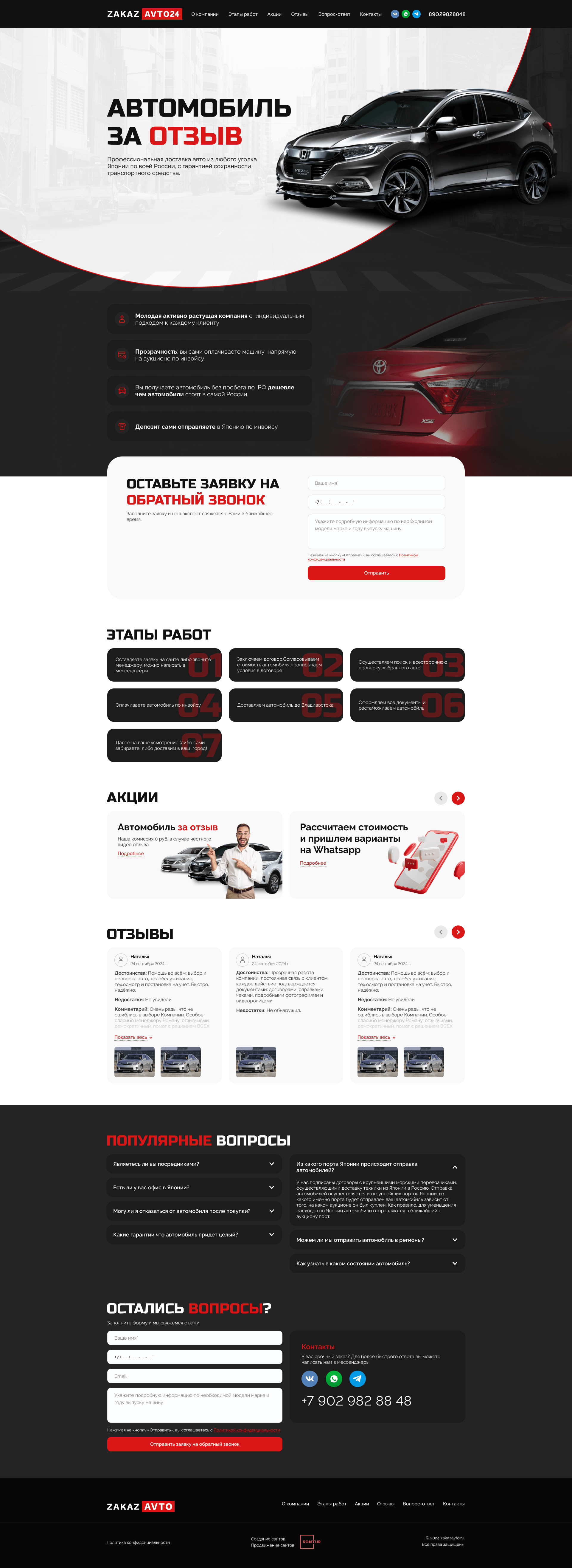 Специалисты нашей компании выполнили все необходимые работы для создания готового Landing Page. Теперь компания "ZakazAvto24" сможет представить свою организацию и услуги в интернете и привлечь новых заказчиков на авто из Японии.