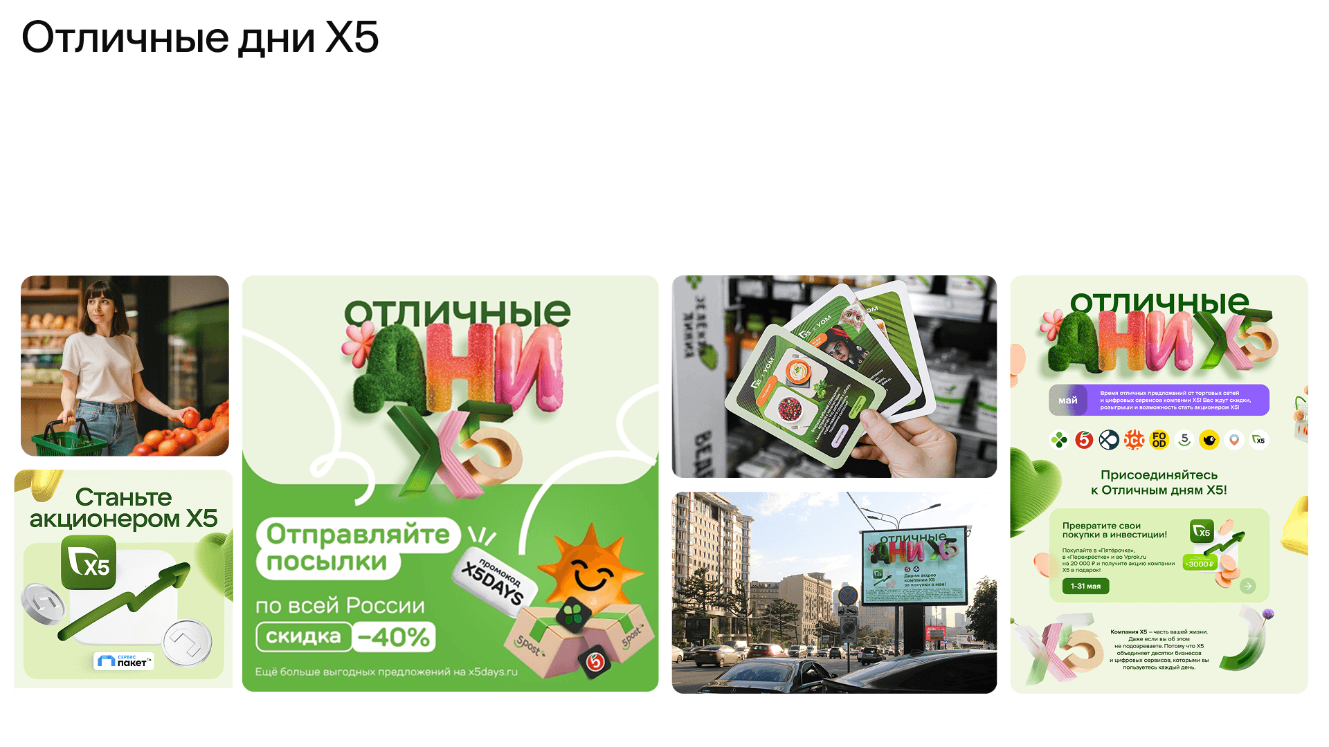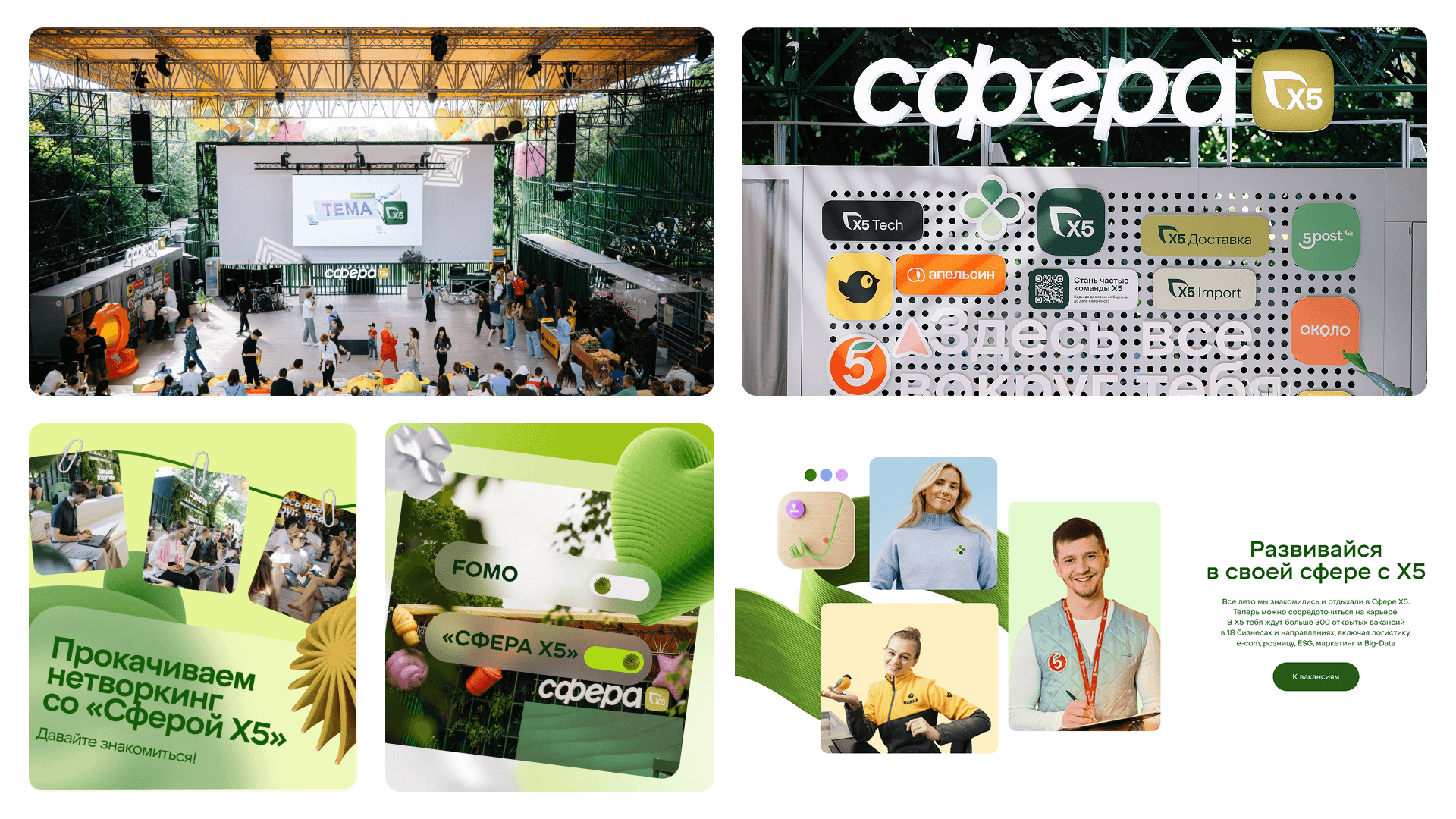 Новая идентичность сразу была реализована в живых активациях: федеральная омниканальная акция «Отличные дни X5» и летнее пространство «Сфера X5» в Парке Горького.