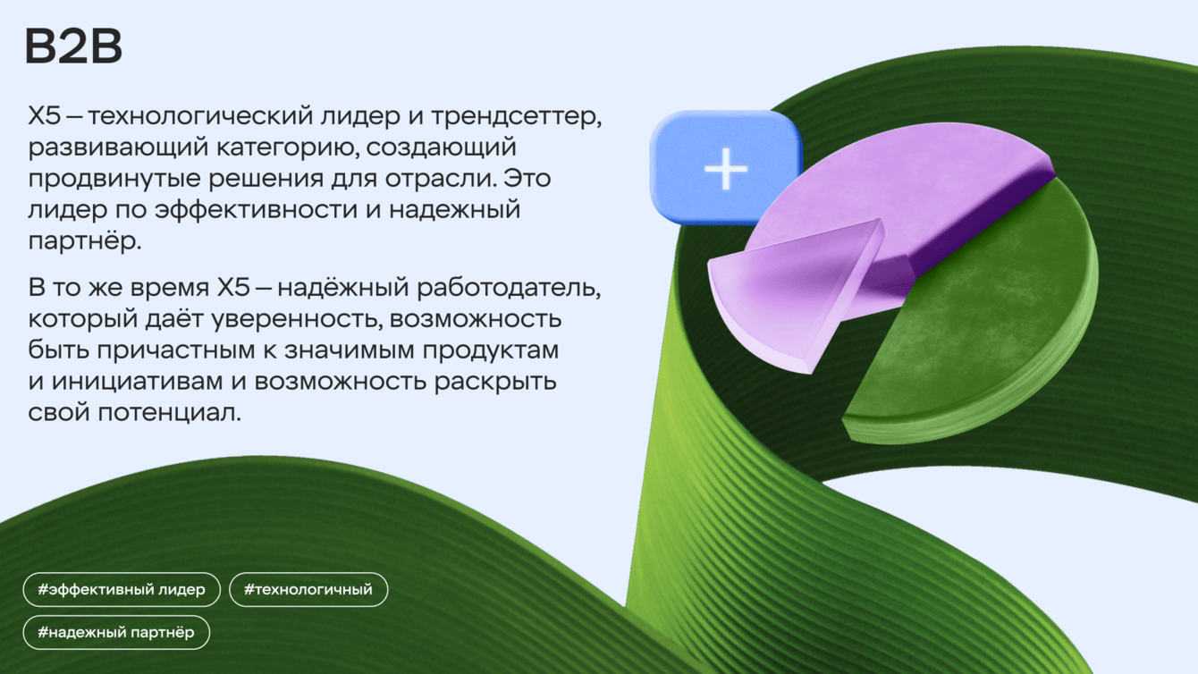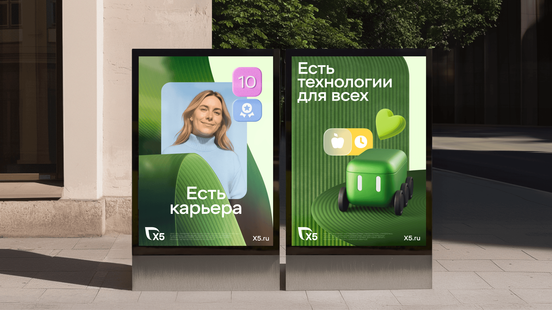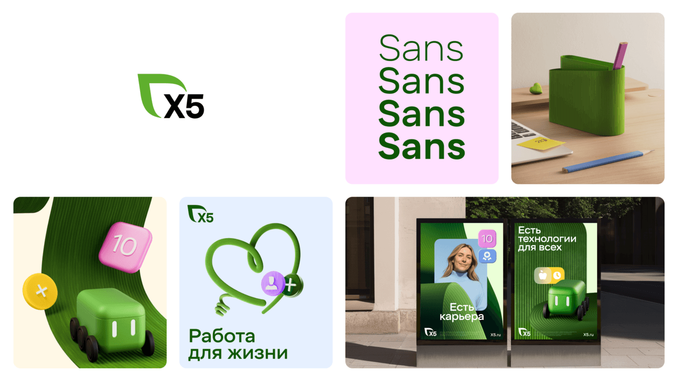 Ключевая задача — создать новую визуальную идентичность и бренд-платформу, которая объединит все направления X5, выведет корпоративный бренд в самостоятельный коммуникационный субъект и станет рабочим инструментом для сотен внутренних команд.