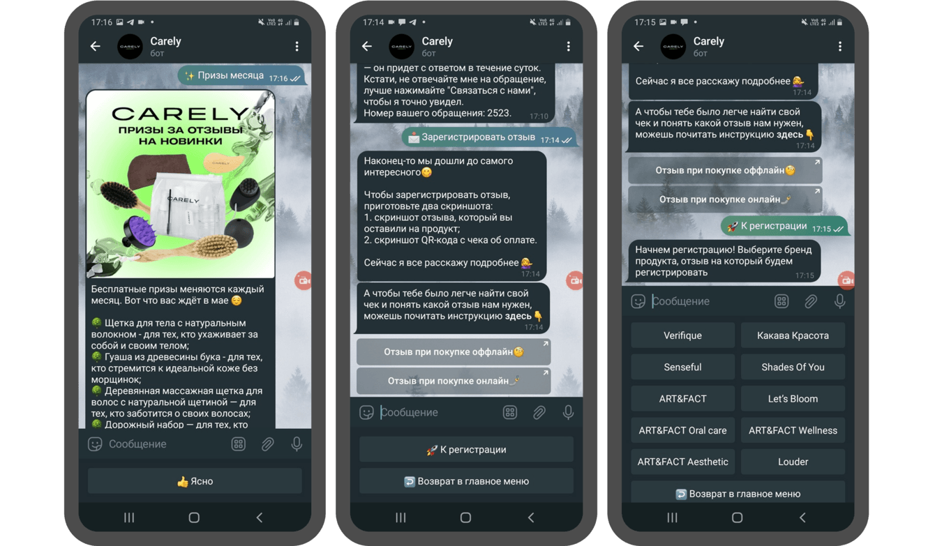 Также важной задачей было объединить все активности в одну систему: связать данные о покупках, отзывах и начисленных баллах, синхронизировать Telegram-бот с уже существующей веб-версией программы и обеспечить техническую стабильность. Помимо этого, Carely стремилась сократить ручную нагрузку на команду — автоматизировать проверку чеков, модерацию отзывов и доставку призов. Это не только ускоряет процесс, но и делает взаимодействие для пользователя более приятным и предсказуемым.