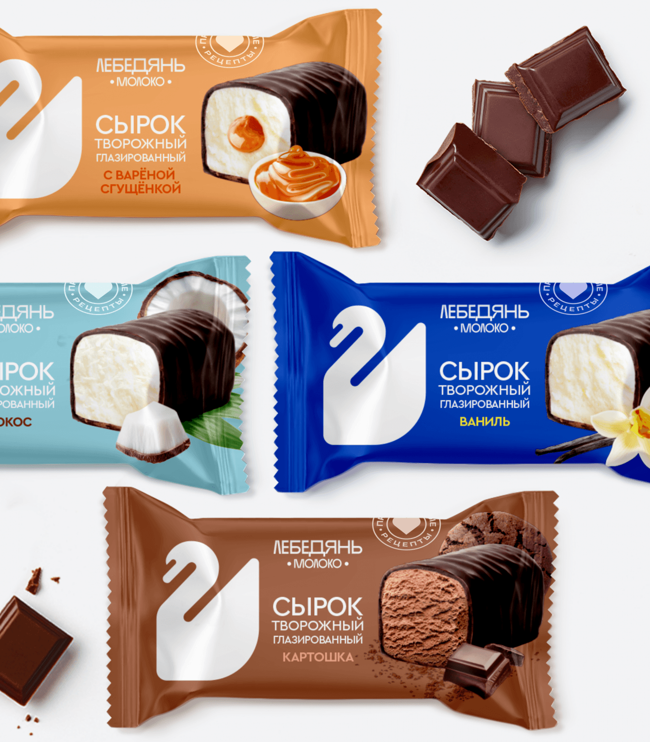 Большое внимание уделили роли маскота бренда — Лебедя. Этот символ исторически связан с компанией, но вот его связь с молочной продукцией была недостаточно очевидной. Мы обратились к символике и семиотике, чтобы усилить его значимость в контексте новой стратегии. Лебедь как символ симметрии, постоянства и красоты был дополнен образом пары лебедей, что укрепило ассоциацию с верностью и стабильностью. С особой щепетильностью прорабатывали характер взгляда у наших лебедей. Отрисовали множество вариантов, чтобы найти тот самый взгляд, который смог передать баланс профессионализма, открытости и человечности.