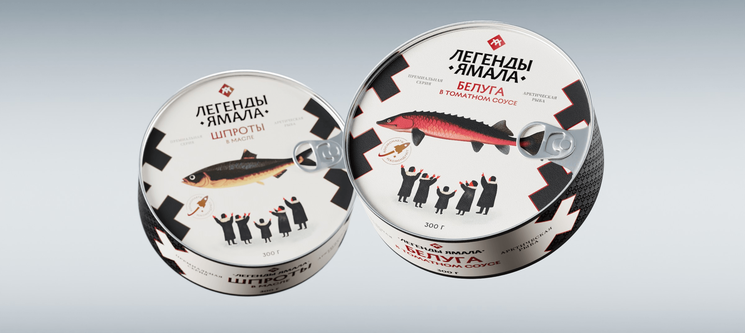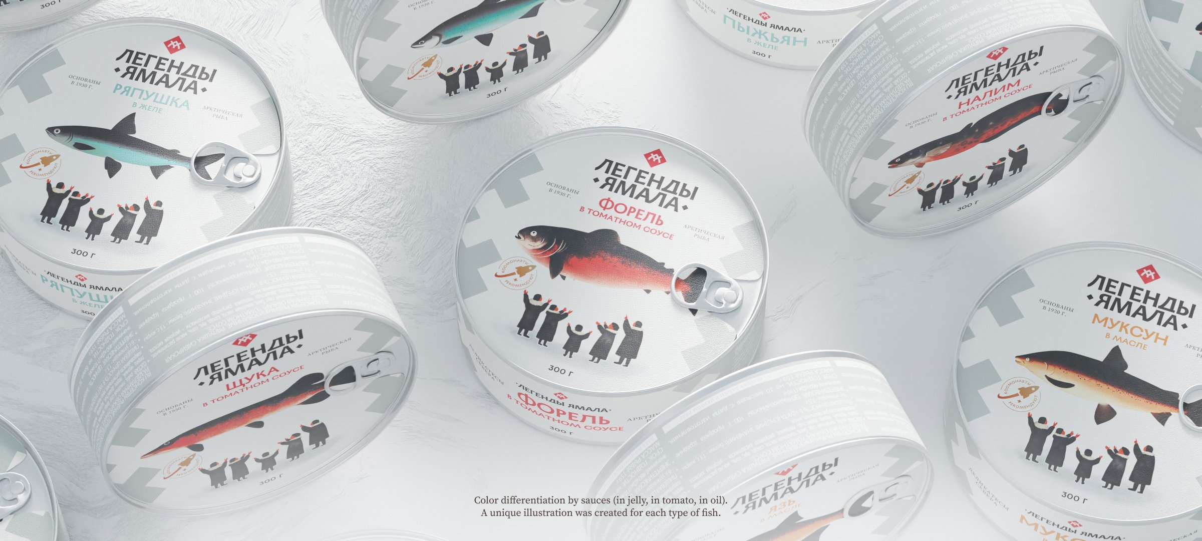 Фуд-зона упаковки — отрисованная продукция бренда (рыба, травы, оленина и т.д.) и иллюстрация местных народов севера (гибко используемые на всех SKU), восхваляющие пищу локального происхождения. Иллюстрации были основаны на линогравюрах Владимира Лебедева (русский и советский живописец, известный своими иллюстрациями детских книжек о севере).