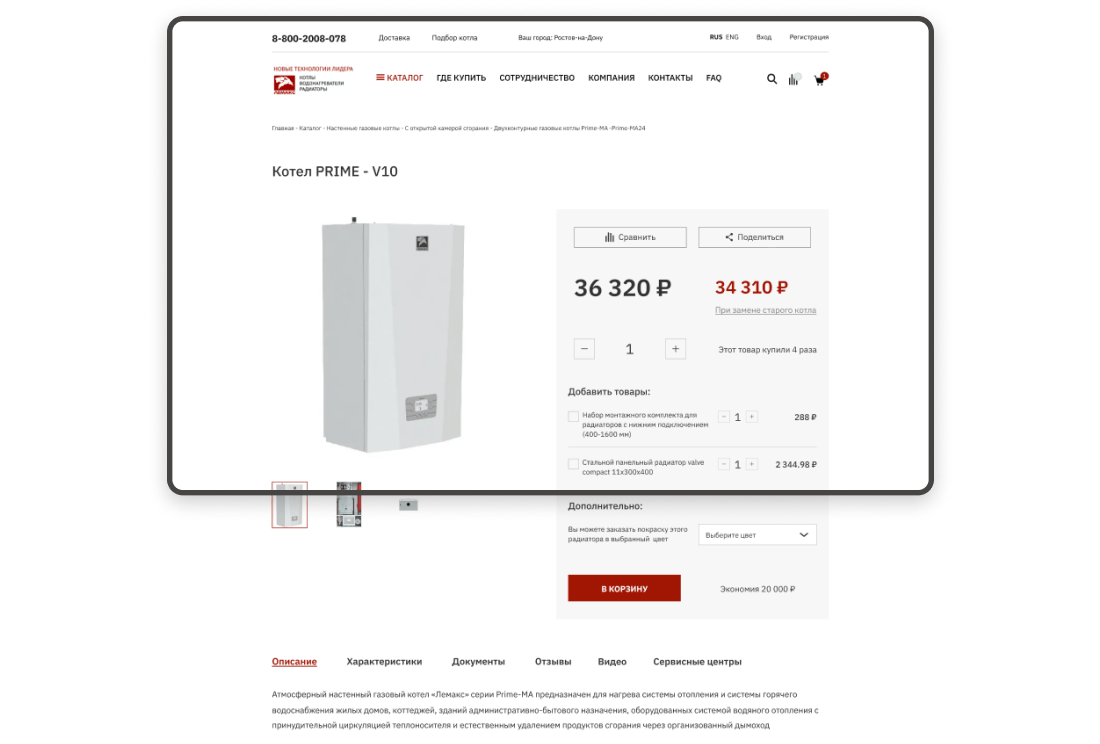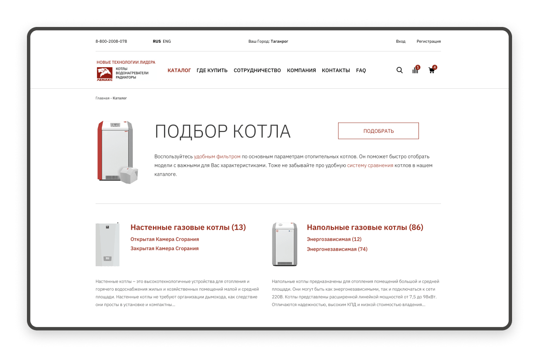 В каталоге четыре уровня, большое количество товаров, несколько сортировок, есть технические страницы, которые делают выборки из каталогов. Есть возможность подбора котла с помощью ответов на несложные вопросы.