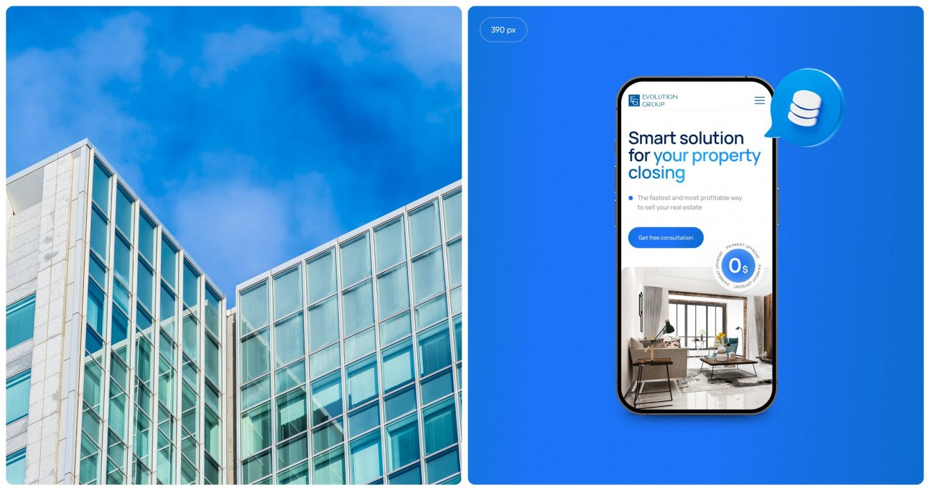 Дизайн страницы вдохновлен интерьерами компании Evolution Group: геометричные, минималистичные с максимально точной и конкретной маркетинговой коммуникацией, которая доносит ключевую информацию до пользователя через текстовые и графические элементы сайта.