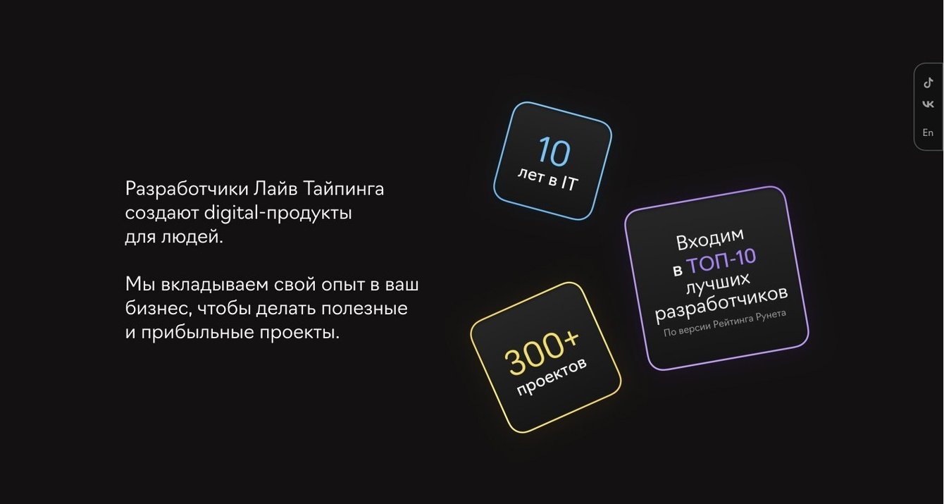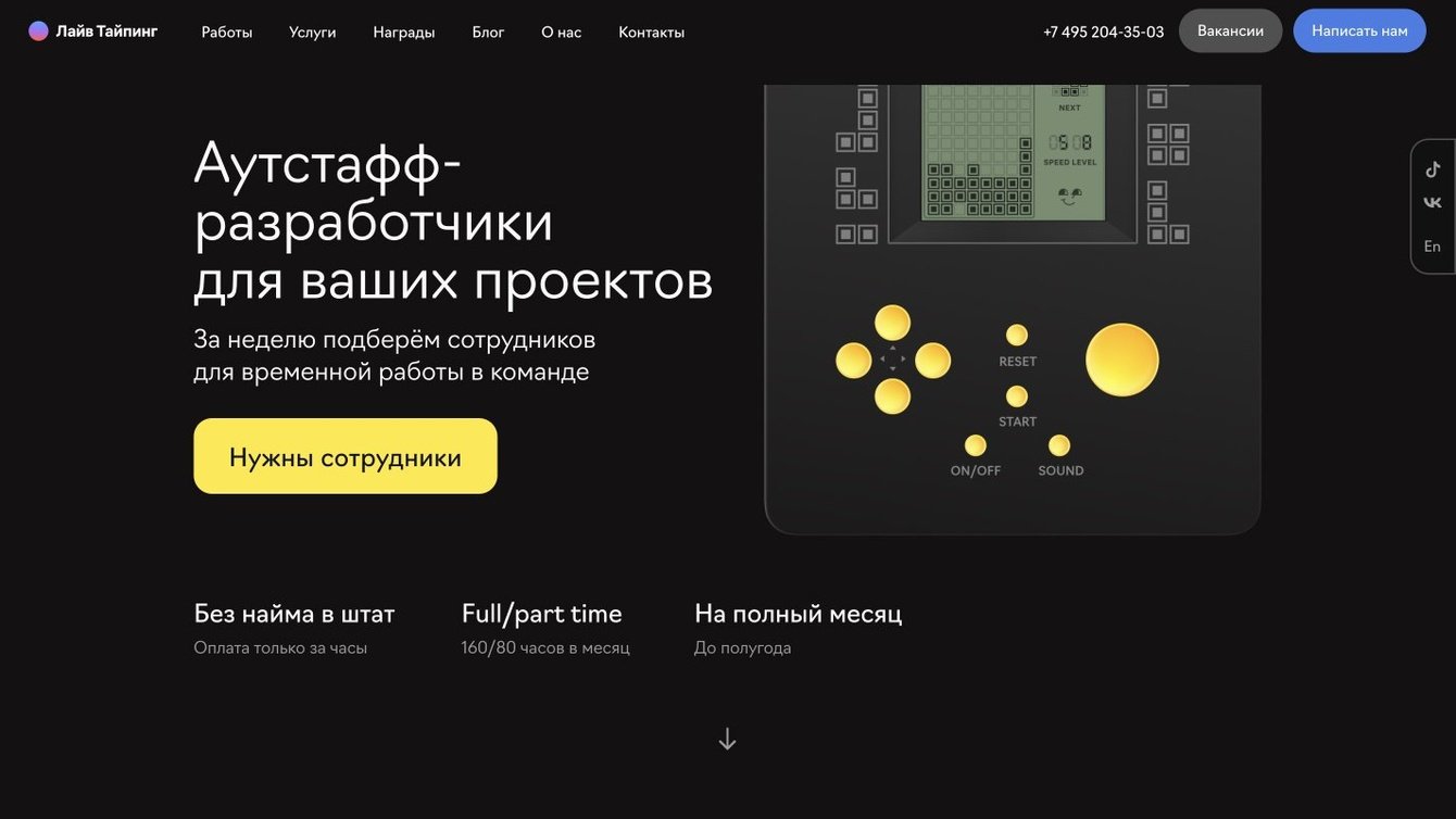 Лендинг «Аутстаффинг» от Лайв Тайпинга больше, чем страница услуги. Это воплощённая метафора. Тетрис. Игра, знакомая каждому клиенту с детства. Вовлекающая, затягивающая, интересная — она объясняет сложный механизм аутстафф-сотрудничества простым языком.
