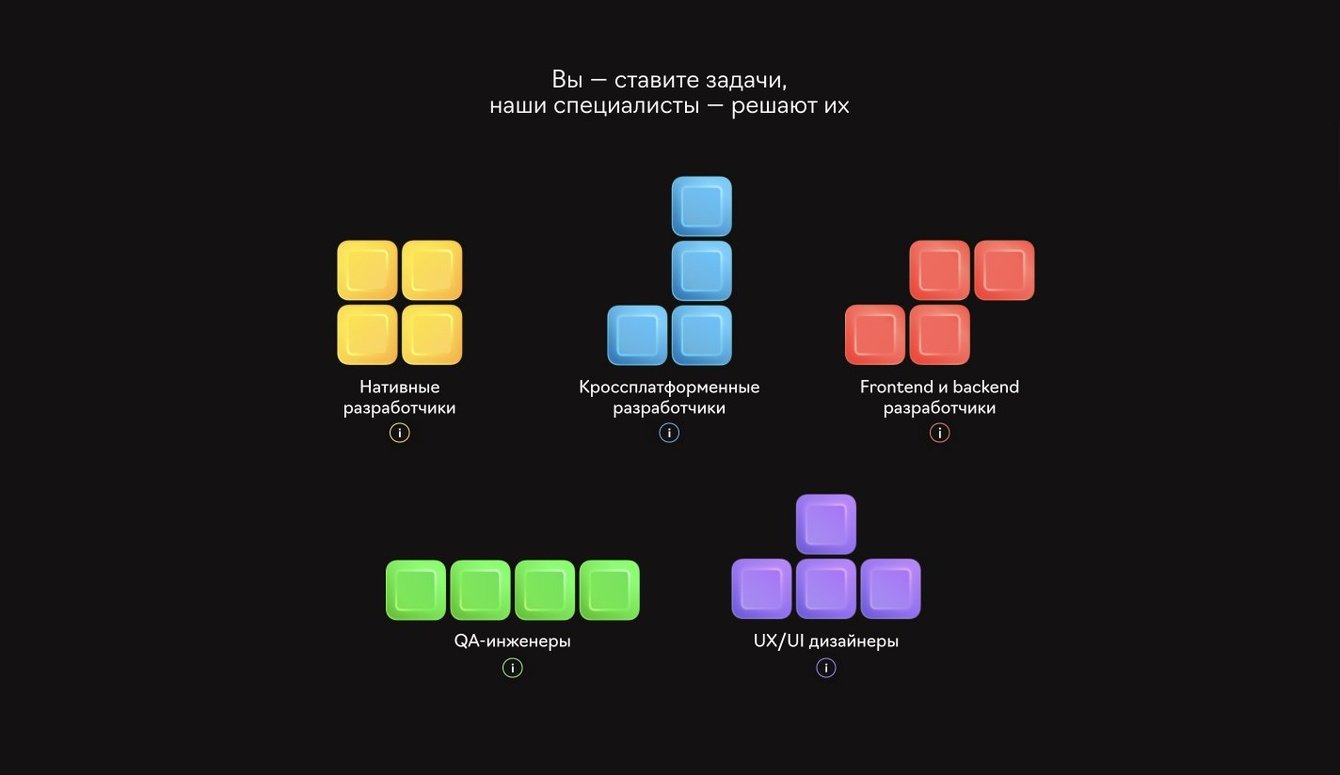 Мы хотели наглядно показать клиенту, что такое аутстаффинг. Концепцию тетриса выбрали потому, что она резонирует с человеческими чувствами, вызывает ностальгию. Тетрис — прекрасная и простая оболочка для громоздкого, ещё не до конца прижившегося понятия аутстаффинг: они уравновешивают друг друга. Человек не пугается нового, а сосредотачивается на уже знакомом. С этого начинается доверие к услуге.