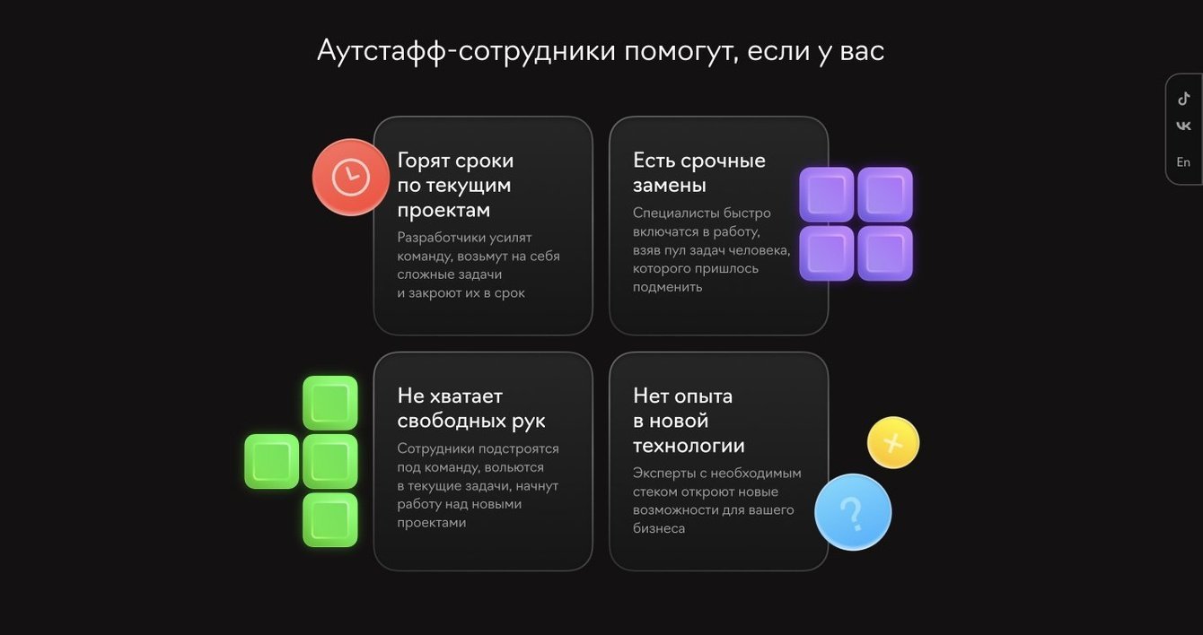 Весной 2021 мы начали развивать новую услугу в компании — аутстаффинг. Чтобы обратить на неё внимание людей, которым нужны другие люди для помощи в работе, мы решили провести рекламную кампанию. Но вот вопрос: куда должны вести рекламные объявления и статьи в СМИ? У нас появилась идея разработать лендинг для новой услуги, который: