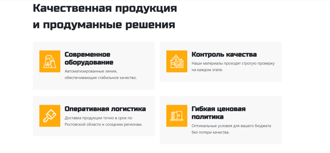 Лендинг проектировался с учётом того, как принимают решение в B2B-сегменте. Поэтому в подаче сделали акцент не только на визуал, но и на практическую пользу: ассортимент, понятные цены, быстрый способ оставить заявку и инструменты, которые упрощают расчёт. В результате сайт помогает не просто знакомить с заводом, а вести пользователя к обращению без лишних шагов.