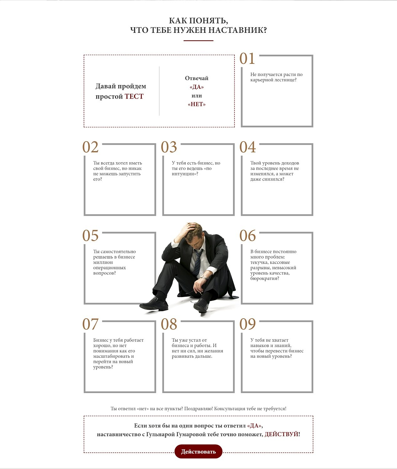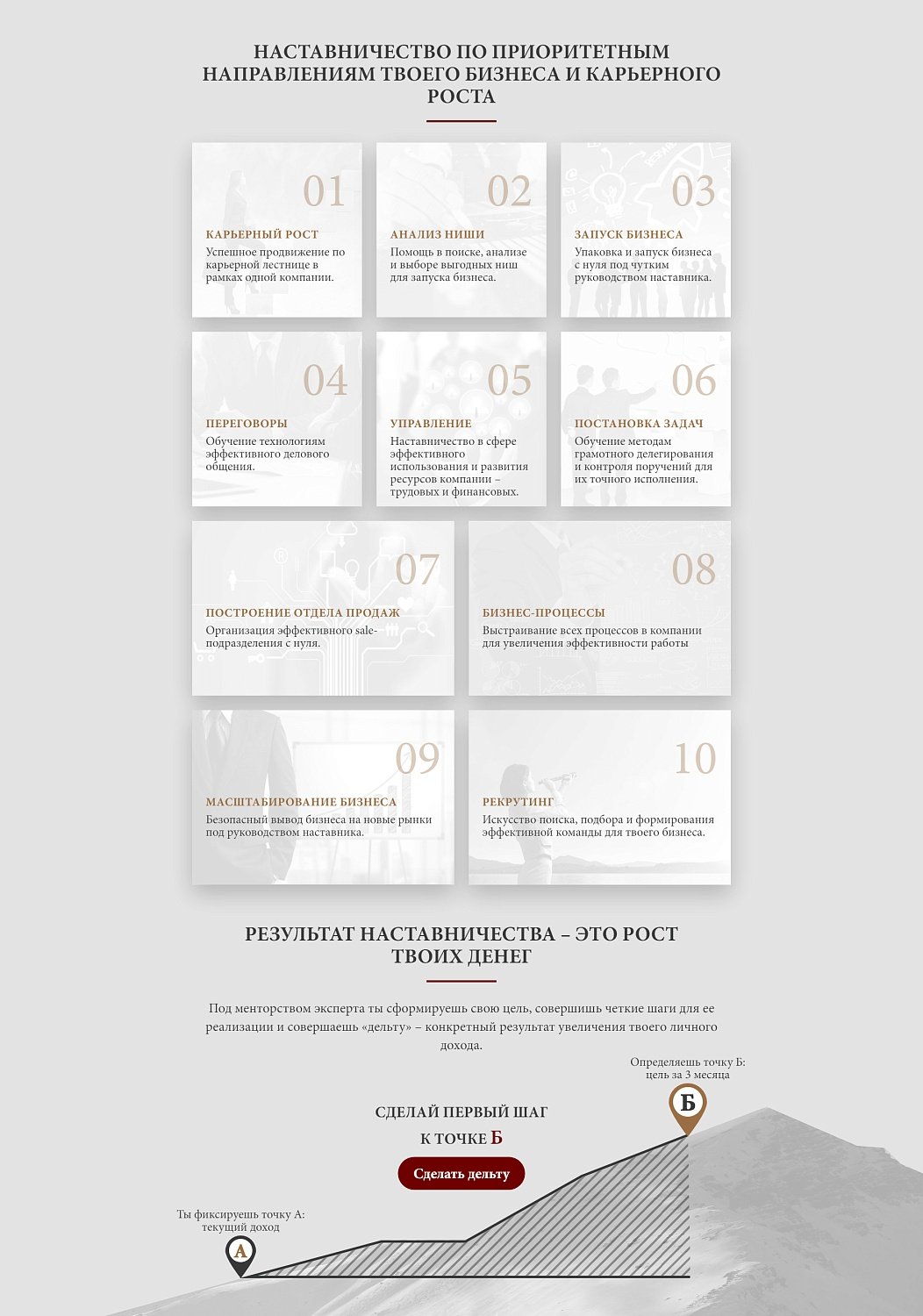 Сделать удобную посадочную страницу для ознакомления целевой аудитории с услугами эксперта в области бизнес-коучинга.