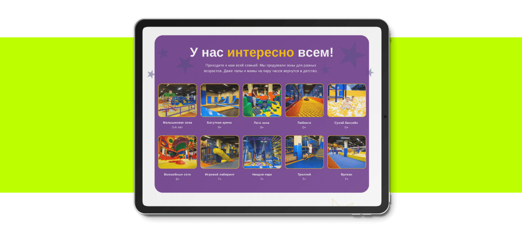 Чтобы ответить на запрос аудитории «Не будет ли скучно моему ребенку?», сделали целый блок с описанием всех зон игрового центра. Указали возрастные ограничения, чтобы родители могли сразу сориентироваться, куда можно попасть ребенку, а до каких зон он еще не дорос.
