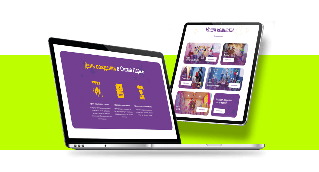 Клиент обратился к нам перед открытием центра. Он хотел сделать одностраничный сайт для повышения узнаваемости бренда. Лендинг должен был рассказывать об услугах центра, отстраивать его от конкурентов. Второй основной задачей была лидогенерация, сбор заявок на проведение дней рождения, выпускных и прочих событий.