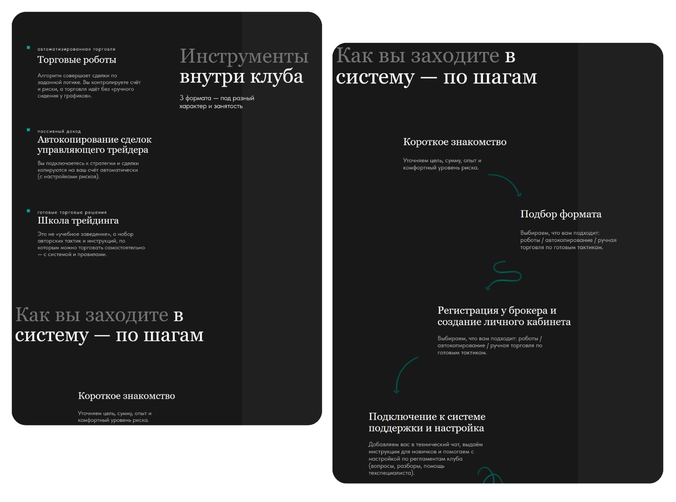 • сложная финансовая информация разложена через карточки, короткие смысловые блоки и понятную последовательность;