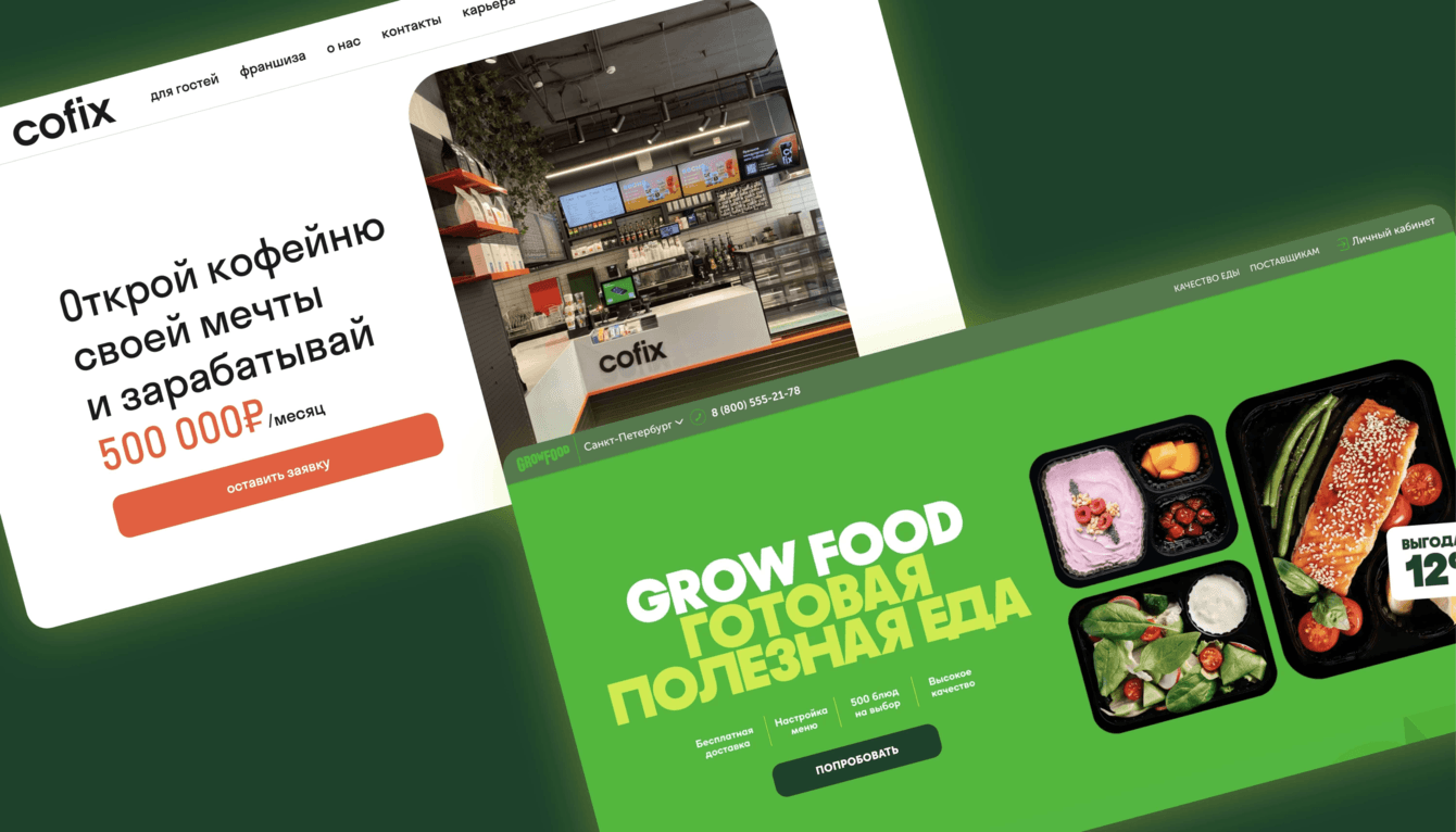 За основу среди референсов мы взяли два сайта — основной GrowFood и Cofix. Они разные по настроению, но отлично отражают две крайности — яркость в первом и лаконичность во втором.
