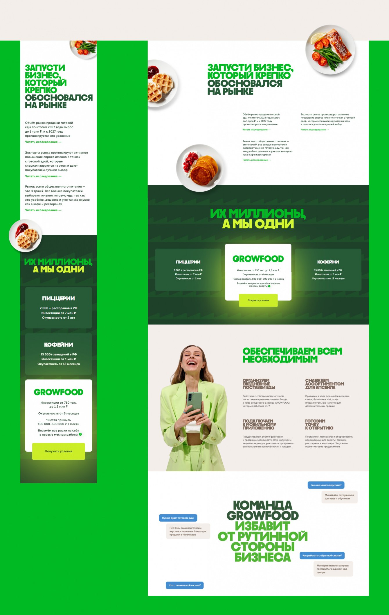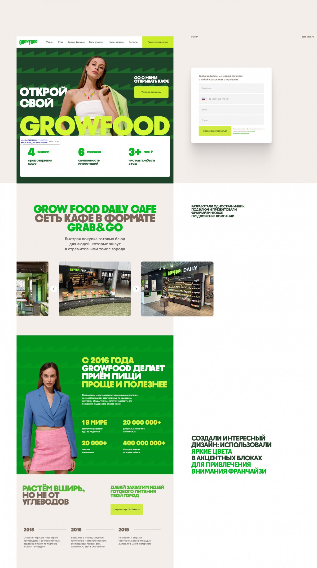 GrowFood известен прежде всего как сервис доставки рационов, поэтому нам нужно было отстроиться от него, чтобы избежать наплыва нецелевых лидов. Для этого мы прямо на втором экране разместили галерею с фотографию точек кафе и сделали акцент в текстах на формате франшизы.