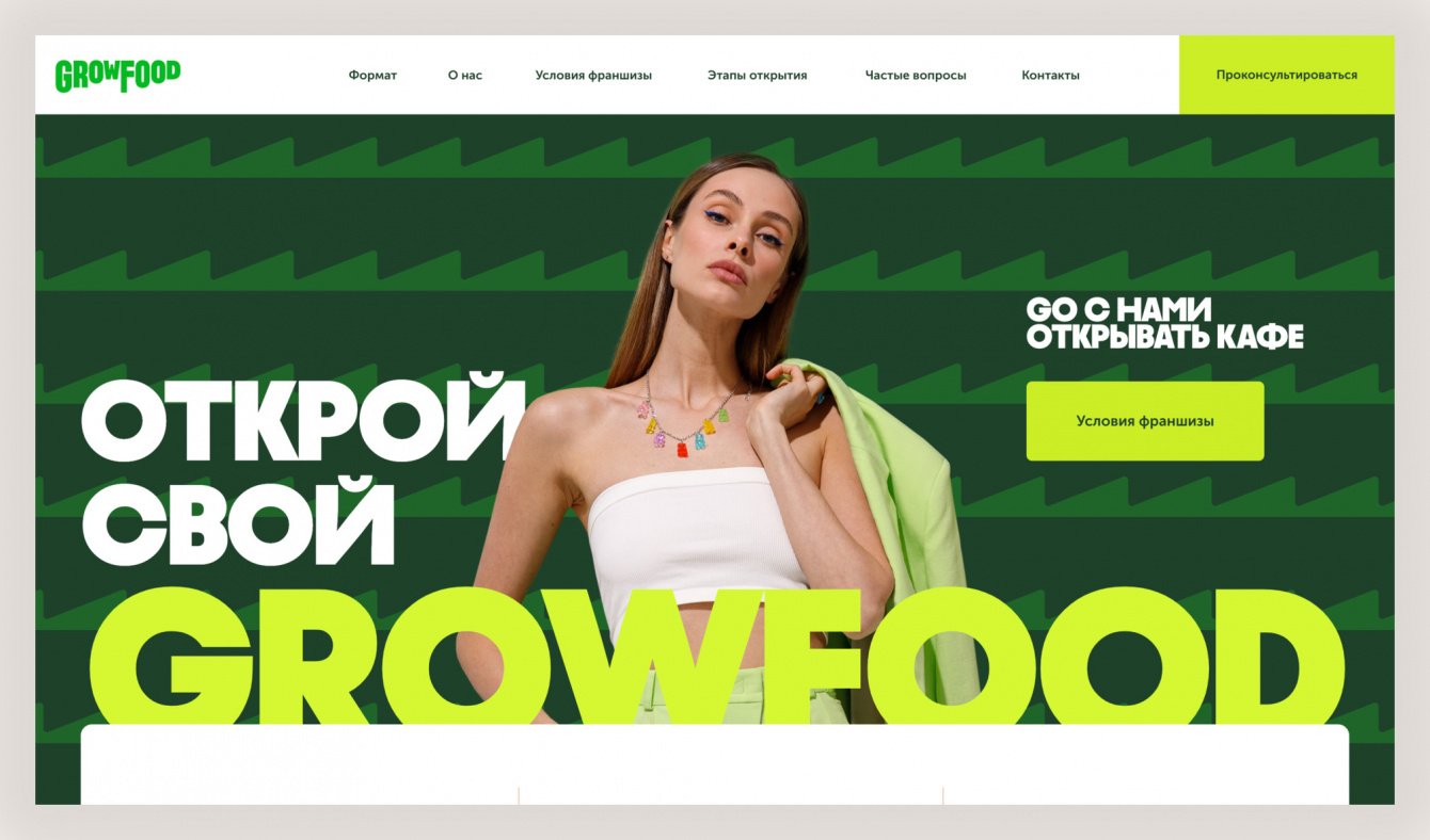 Основное направление работы компании — доставка готовых рационов, но не так давно GrowFood вышли на рынок с форматом Daily Café — это кафе с готовой полезной едой и напитками. Направление кафе планируется развивать с помощью франшизы, для презентации которой мы и создавали сайт.