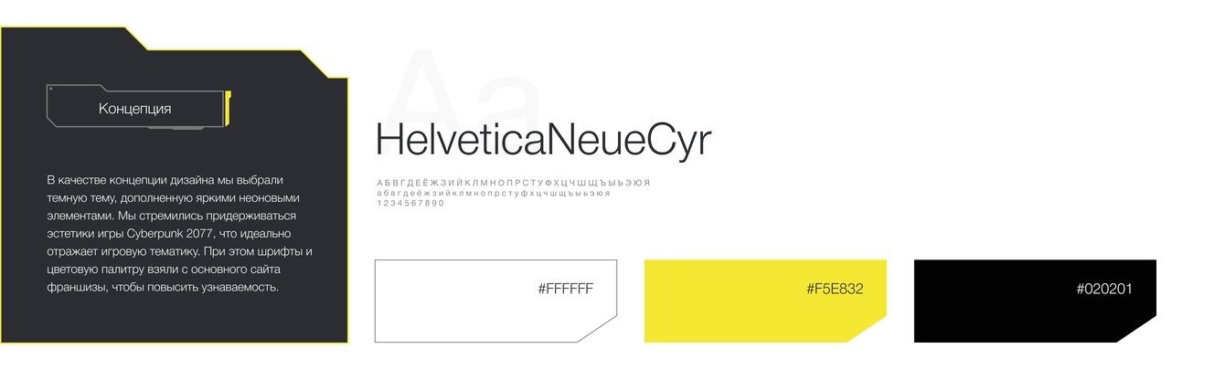 В качестве концепции дизайна мы выбрали темную тему, дополненную яркими неоновыми элементами. Мы стремились придерживаться эстетики игры Cyberpunk 2077, что идеально отражает игровую тематику. При этом шрифты и цветовую палитру взяли с основного сайта франшизы, чтобы повысить узнаваемость.