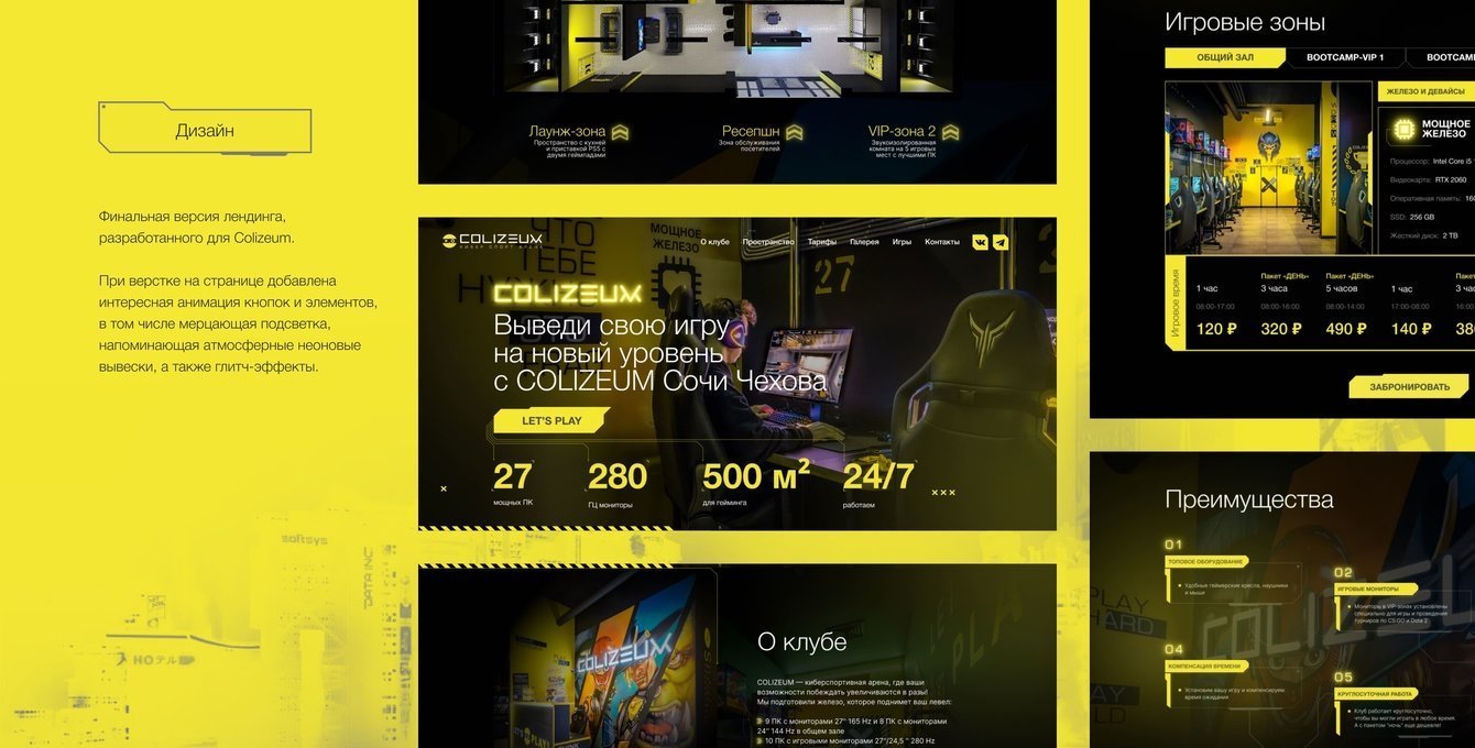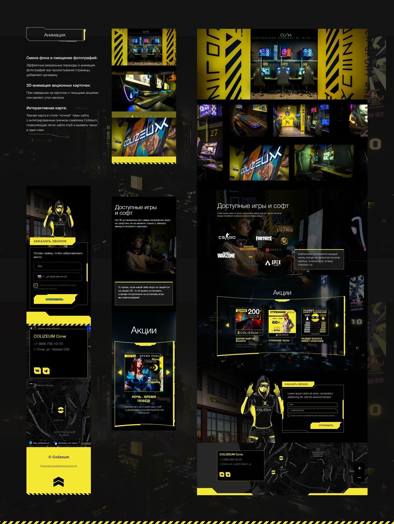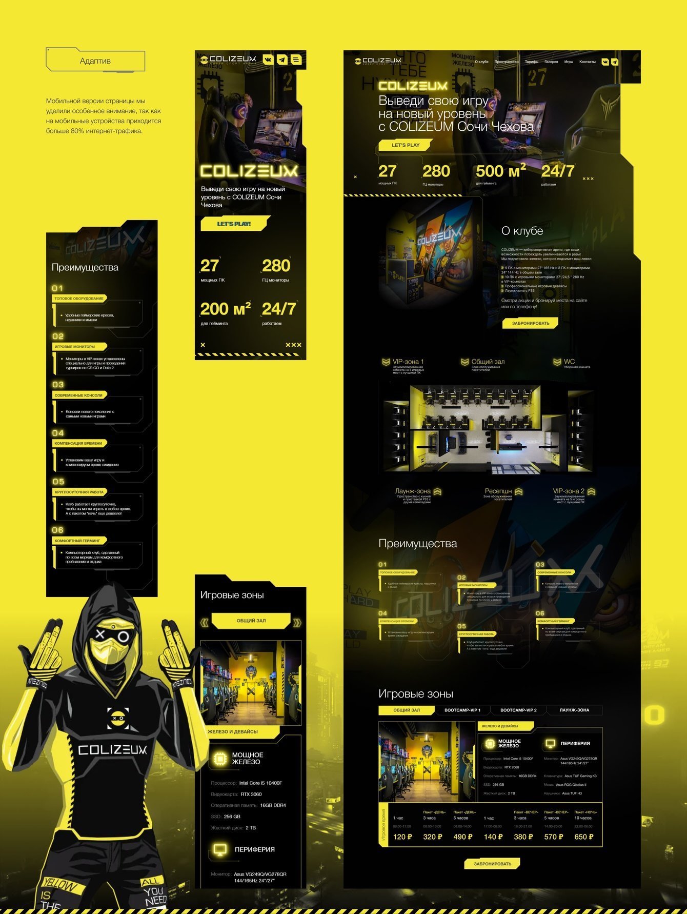 Мы справились с задачей уместить в дизайне фирменный стиль франшизы и яркие элементы киберпанка и игрового интерфеqса. Вместе с удобной навигацией всё работает на привлечение новых игроков и развитие сети киберспортивных клубов Colizeum.