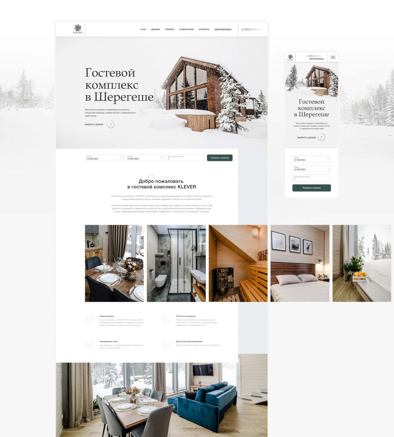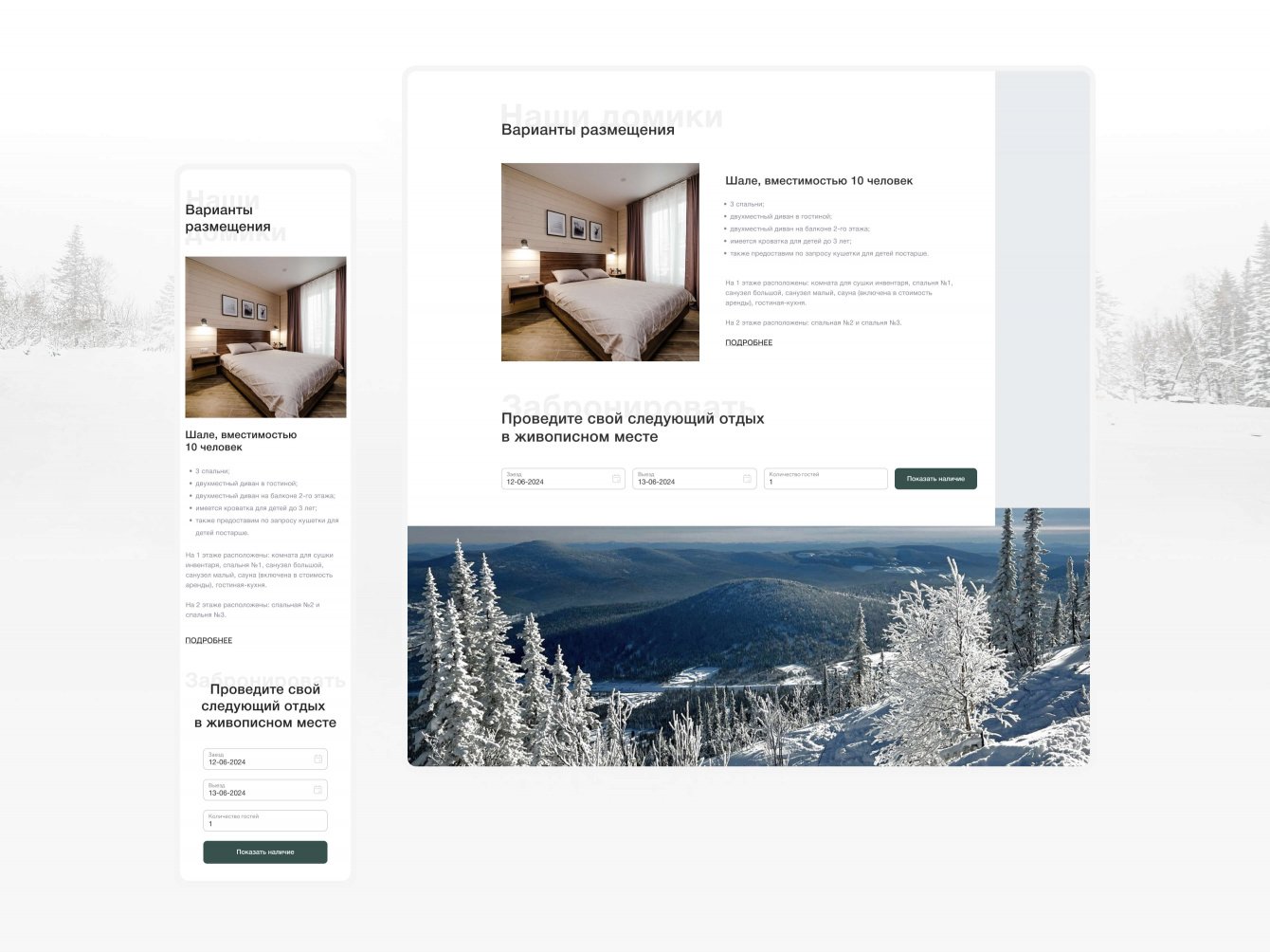 Задачей проекта была разработка лендинга, который должен отражать уют и комфорт высококлассного гостевого домика в заснеженных горах, привлекая целевую аудиторию к бронированию отдыха. При этом пользователи не только должны были иметь возможность посмотреть интерьер домиков и ознакомиться с условиями проживания, но и легко забронировать понравившийся вариант.