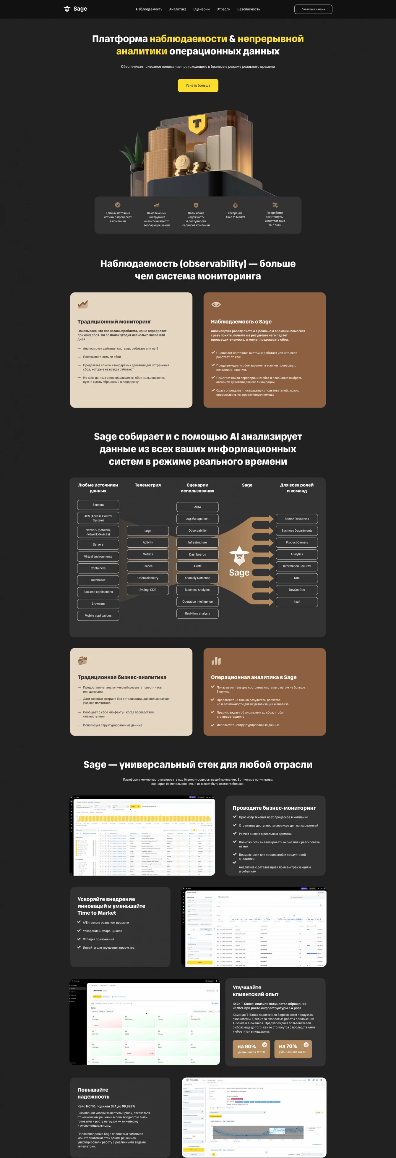 Sage — платформа наблюдаемости и непрерывной аналитики операционных данных. Это сложный цифровой продукт от центра разработки Т-Банка, чтобы проводить мониторинг и анализировать работу ИТ-систем внутри компаний. Клиент пришел к нам с задачей в сжатые сроки сделать лендинг перед крупным IT-конгрессом «Подмосковные вечера». Мы собрали команду и за две недели сделали главную страницу сайта с нуля.