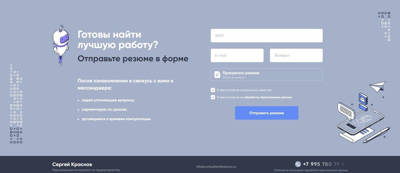 И, наконец, мы дали возможность пользователям связаться со специалистом разными методами — позвонить, написать на email, отправить резюме через форму на сайте.