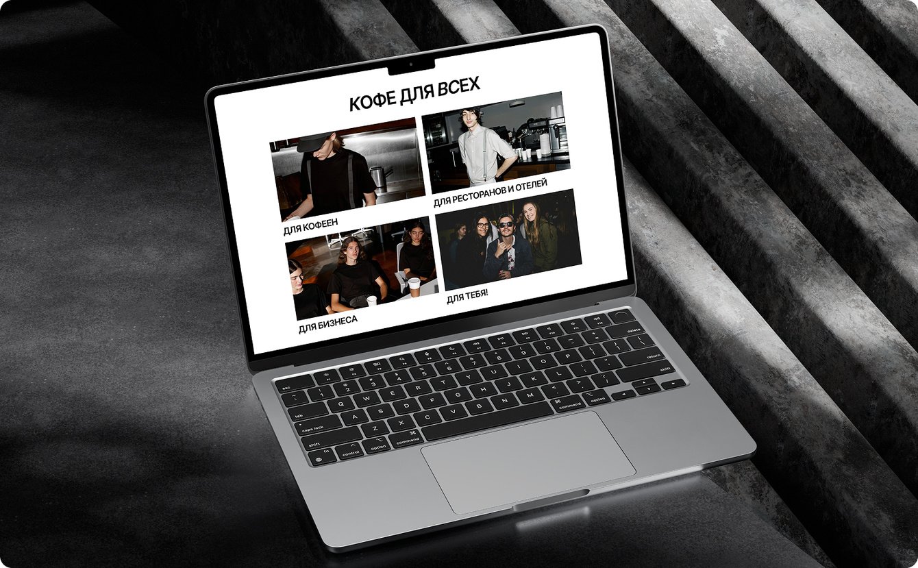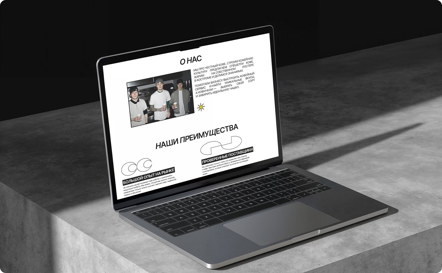 Мы показали не безликий бренд, а людей. Фото команды сняты в естественной атмосфере, без постановки. Тексты написаны от первого лица — будто ребята сами рассказывают, как всё устроено. Пользователь сразу чувствует эмоциональный контакт: он знает, кто стоит за кофе, который он пьёт. При этом такой подход демонстрирует прозрачность и честность: на сайте подробно рассказано о каждом этапе сотрудничества, и становится понятно, как легко и удобно работать с компанией. Это создаёт доверие и подчёркивает преимущества взаимодействия с командой.