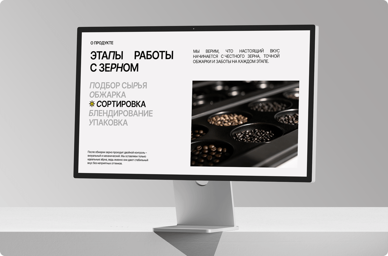 Вместо длинных текстов — простая визуальная логика. Мы разложили путь зерна на понятные шаги: от сбора — к обжарке и упаковке. Фото с крупными планами обжарки создают ощущение вовлечения в процесс. Этот блок даёт пользователю не только информацию, но и доверие: кофе делают профессионалы, у которых всё под контролем.