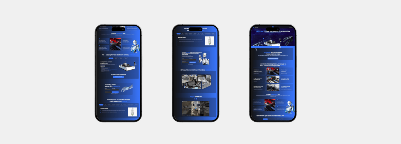 Мы создали адаптивную версию для всех устройств, настроили плавные переходы между блоками, оптимизировали анимации, подключили формы заявок и структурировали информацию о станках.