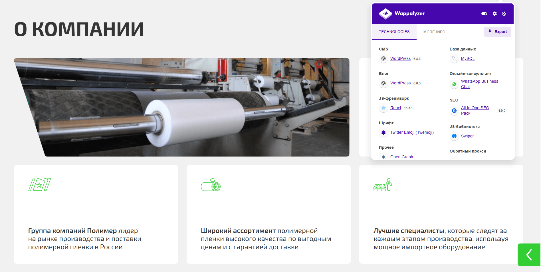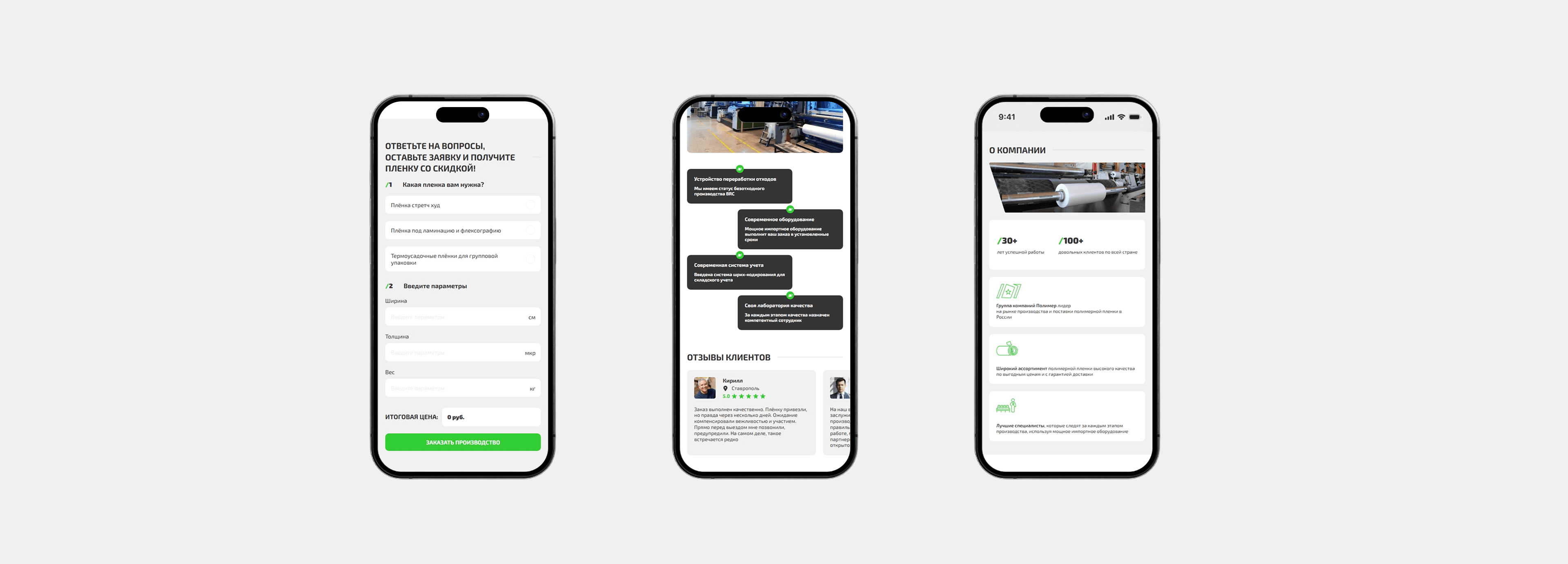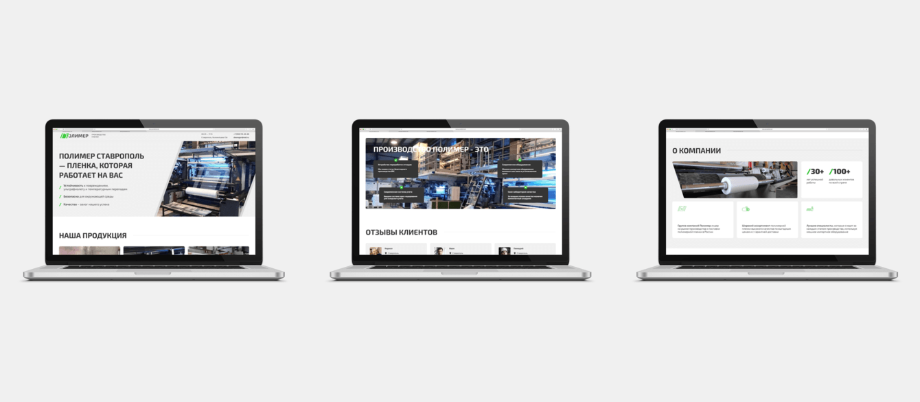 Структура сайта рассказывает историю компании и её продукции шаг за шагом: от преимуществ производства и качества пленки до ассортимента и условий доставки. Мы сделали акцент на практическую ценность для клиента: сразу видно, чем компания отличается от конкурентов, и почему работать с Полимером удобно и выгодно.