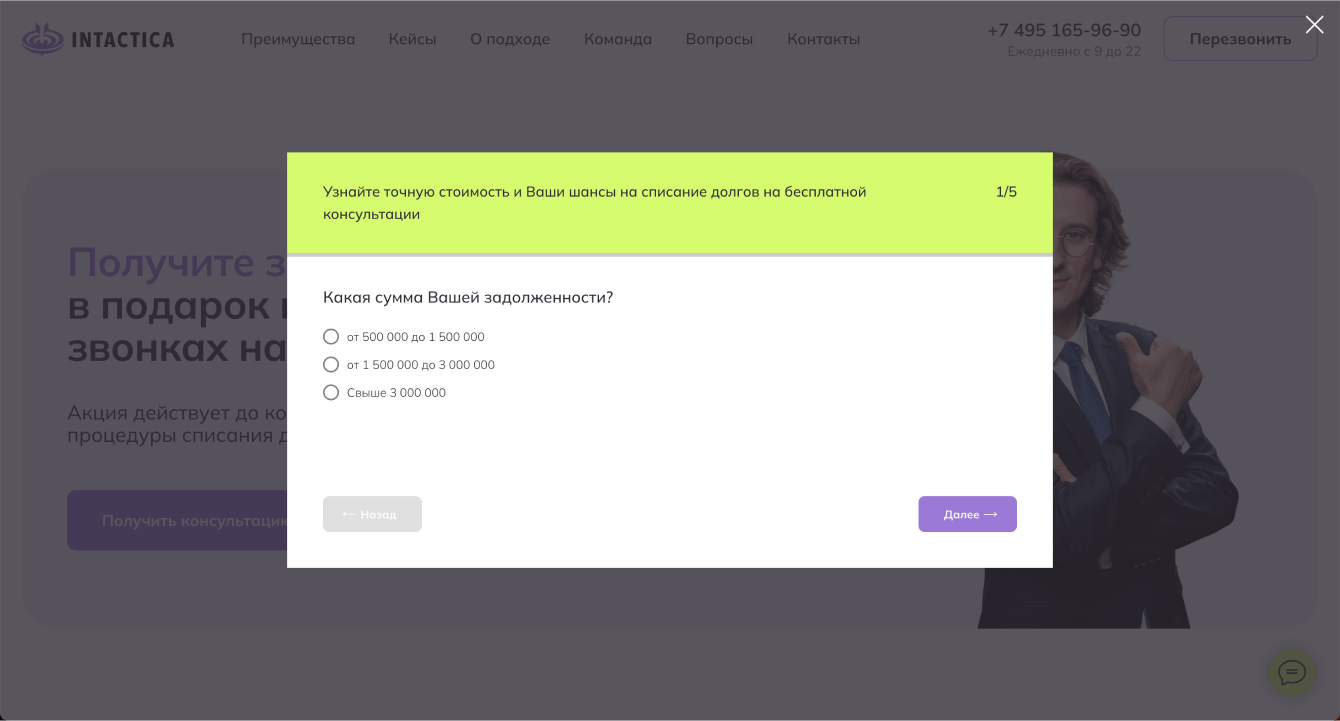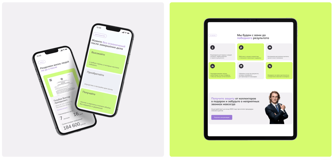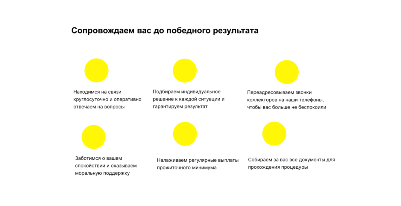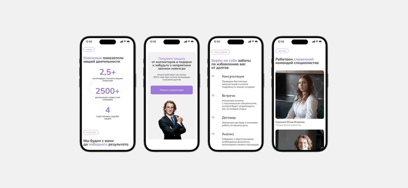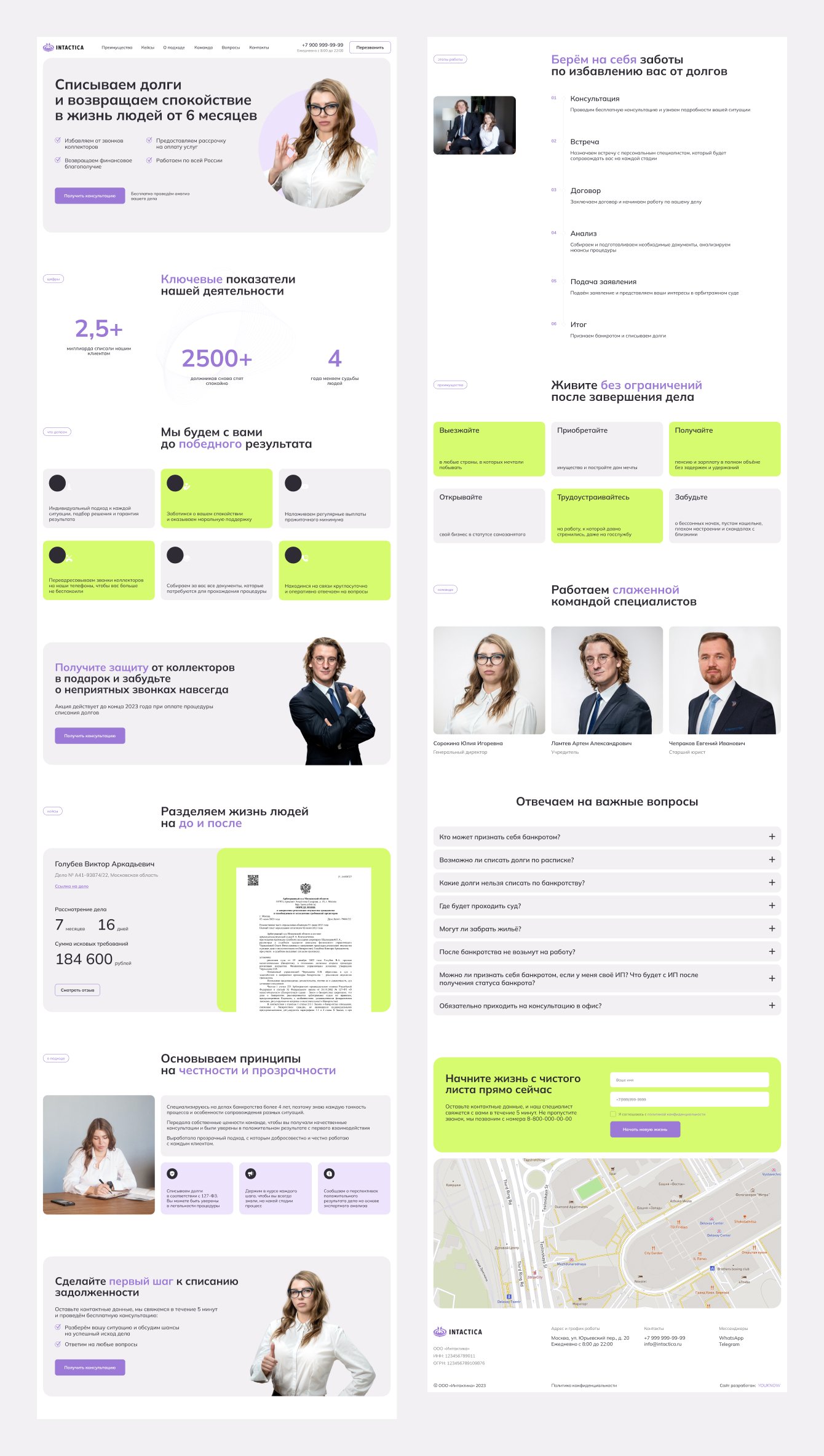Когда копирайтер получил готовую маркетинговую структуру лендинга, он создал тексты, которые точно отражали наши ключевые преимущества, подкрепляли их цифрами, а также включали реальные кейсы клиентов по банкротству и успешным разрешённым делам. Тексты были разделены по блокам, каждый из которых отвечал на важные для клиента вопросы и помогал выстроить доверие.