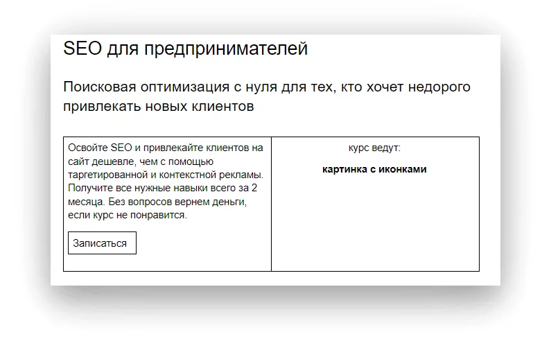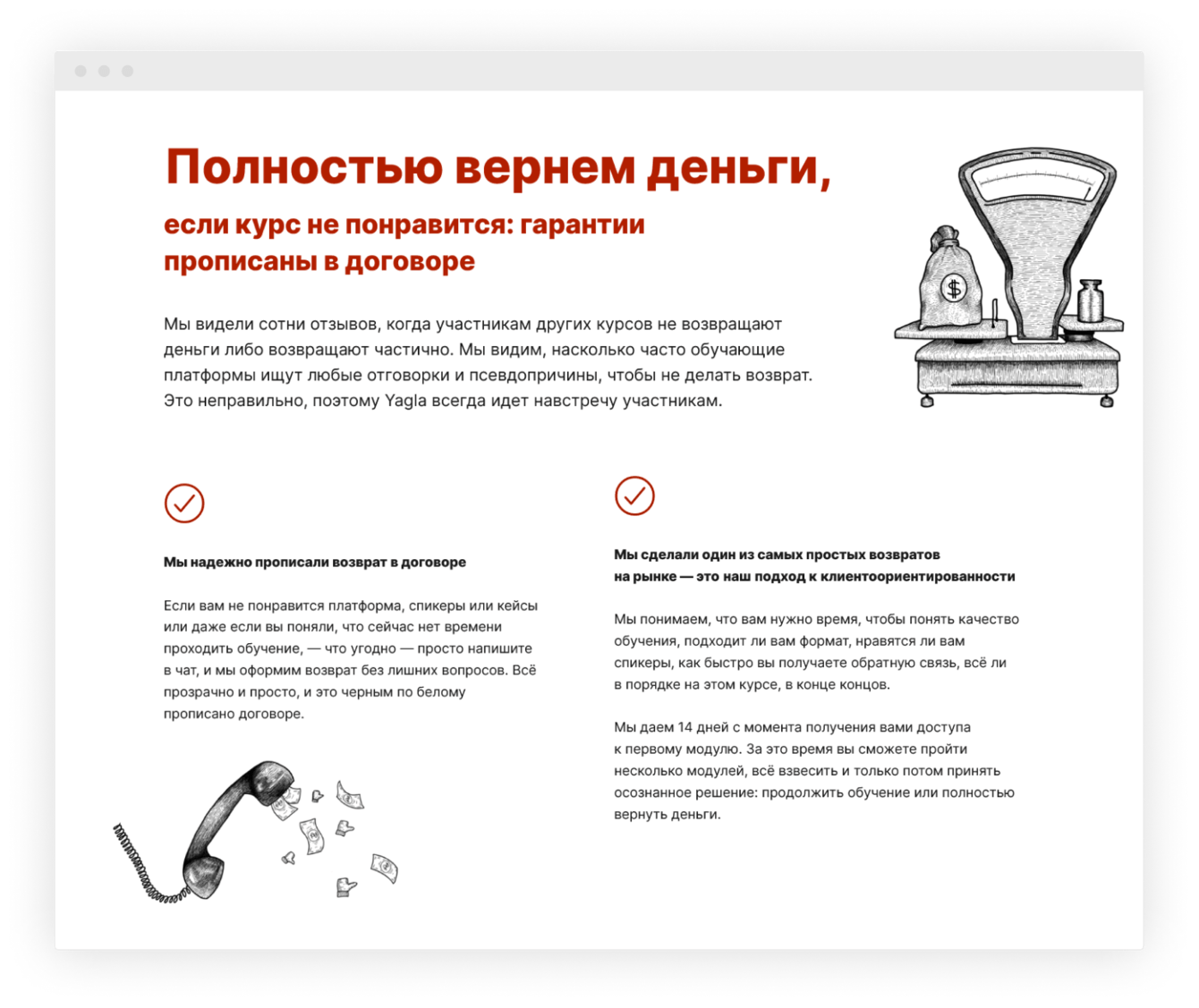 А еще у клиента есть классная фишка: он возвращает деньги за курс в течение 14 дней и не требует обоснований. Мы решили отдельно подсветить это преимущество