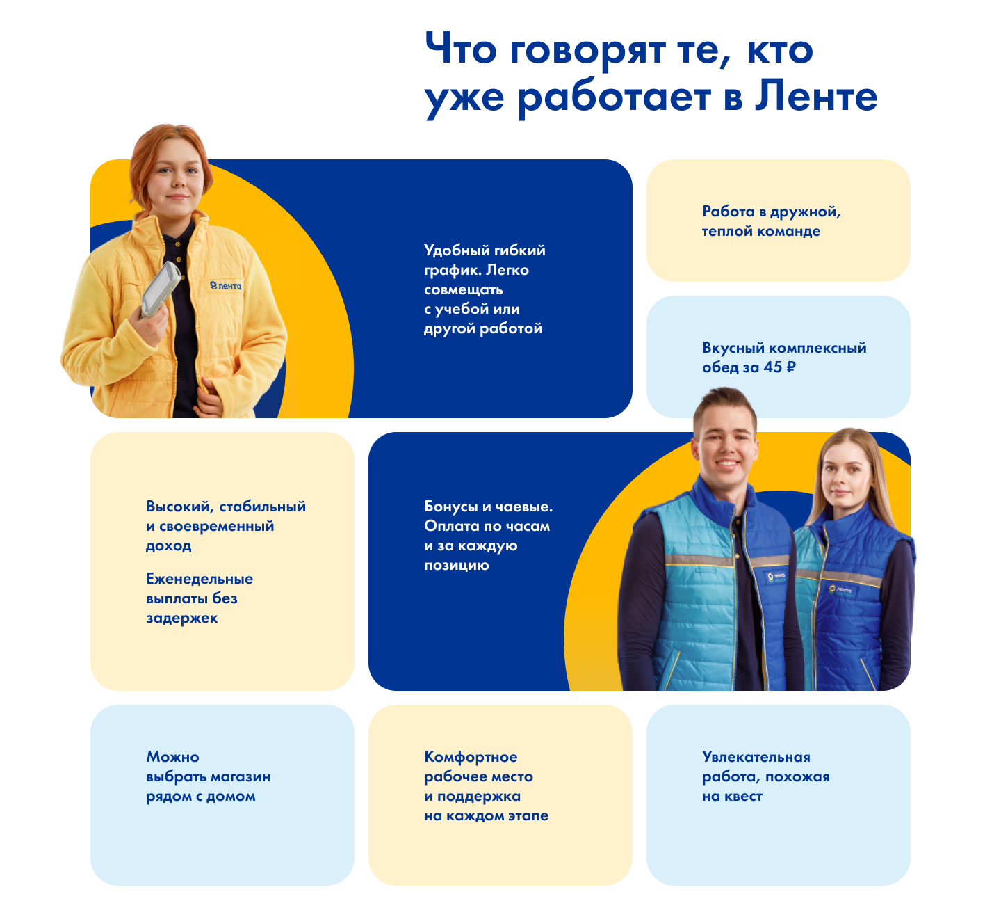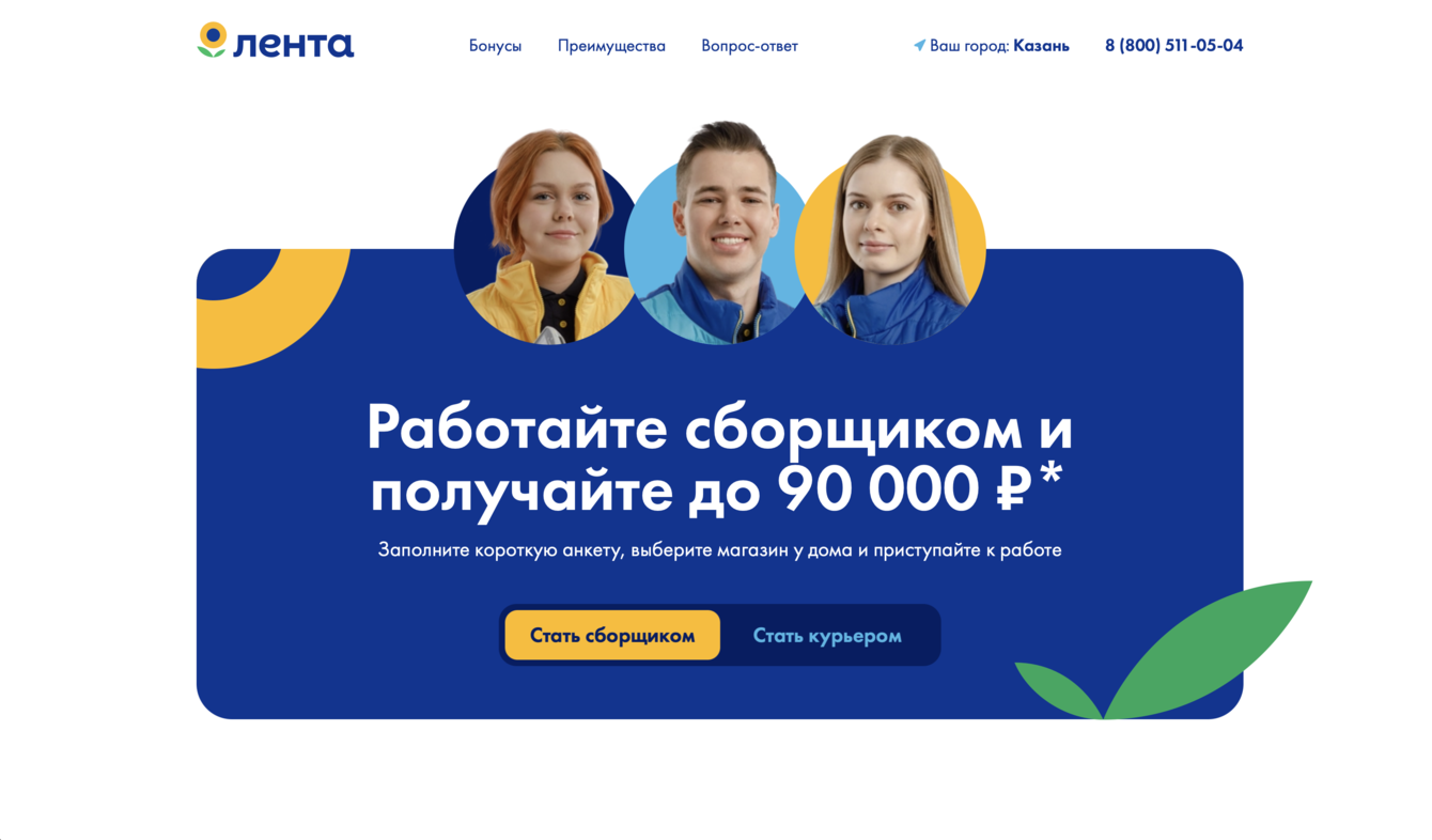 «Ленте» нужно было быстро и массово закрывать вакансии для курьеров и сборщиков. Их аудитория — студенты, люди постарше, приезжие. Им важно одно: всё честно и просто. Сколько платят? Как работается? Какая атмосфера? Старый сайт на эти вопросы не отвечал. Нужен был инструмент для честного разговора, который ещё и уложится в строгий брендбук крупной сети.