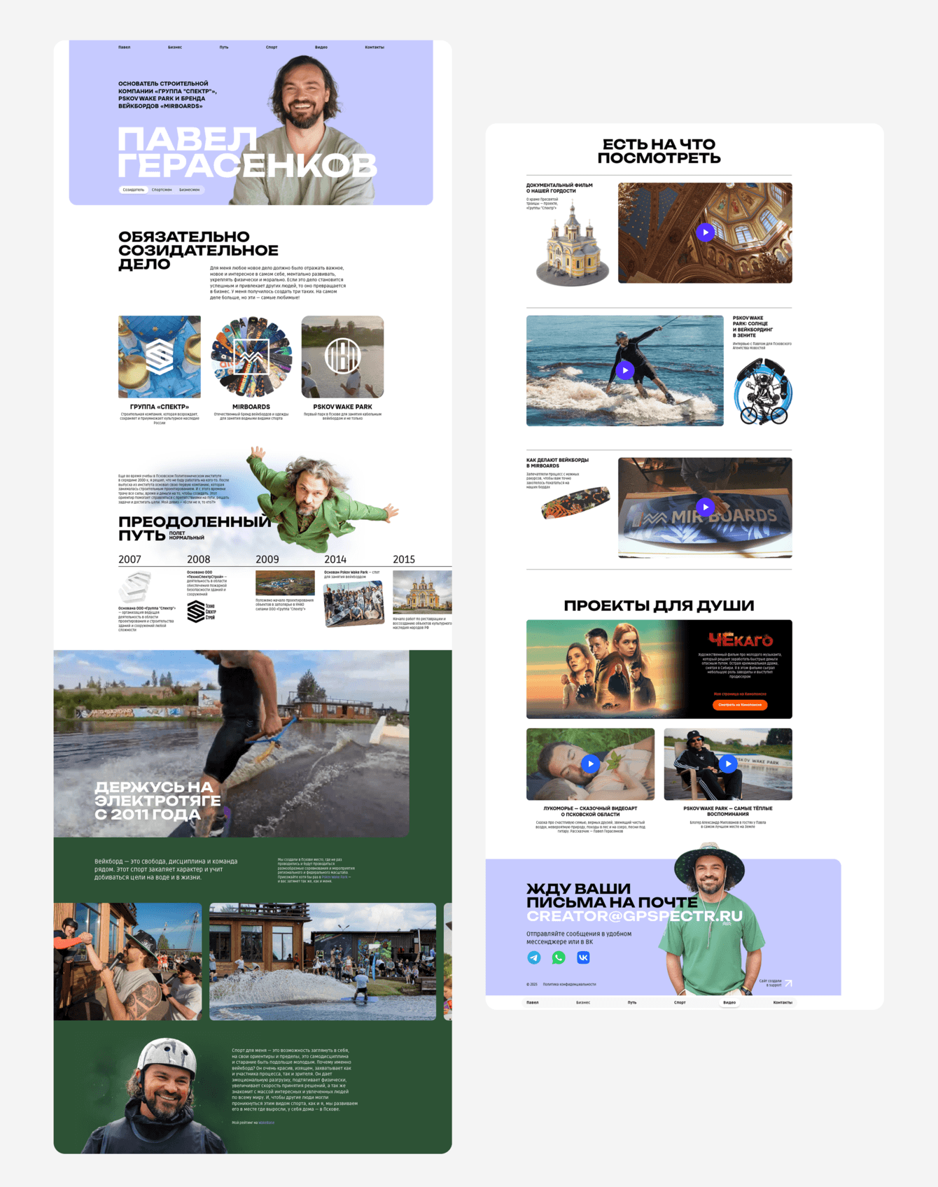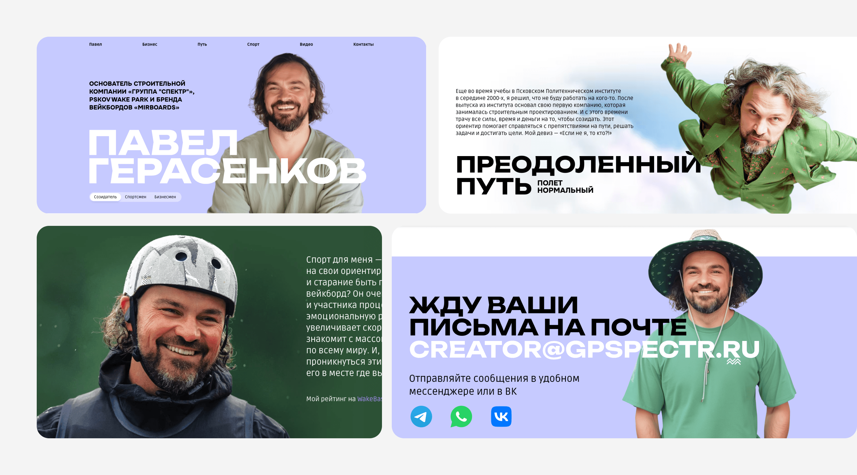 Мы структурировали контент так, чтобы показать все сферы его профессиональной и творческой реализации, связав их в единую историю. Каждый раздел помогает глубже понять экспертизу и подход клиента, а визуальный стиль усиливает ощущение целостности и уверенности.