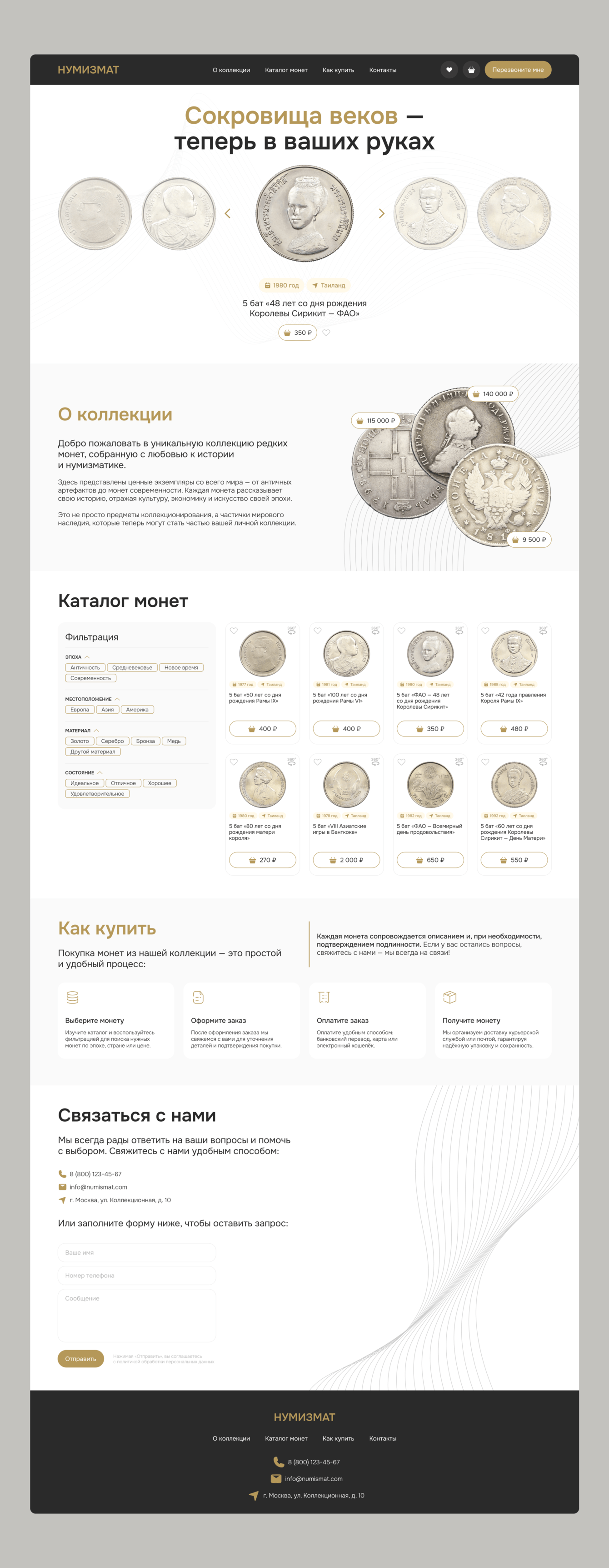 Этот концепт лендинга для нумизмата ориентирован на сочетание исторического наследия и современного удобства. Он призван подчеркнуть профессионализм владельца сайта, продемонстрировать ценность монет и вдохновить посетителя стать частью мира нумизматики — будь то покупка, оценка или простое любопытство к редким артефактам.