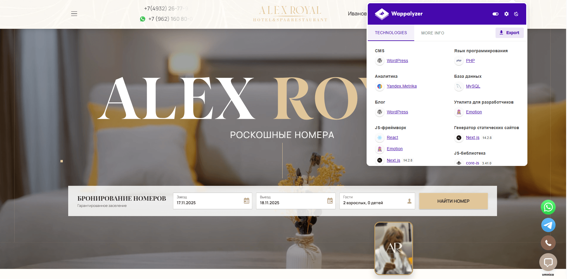CMS WordPress использована как удобная панель управления, через которую команда отеля может обновлять контент, добавлять фотографии, корректировать описания и управлять публикациями.