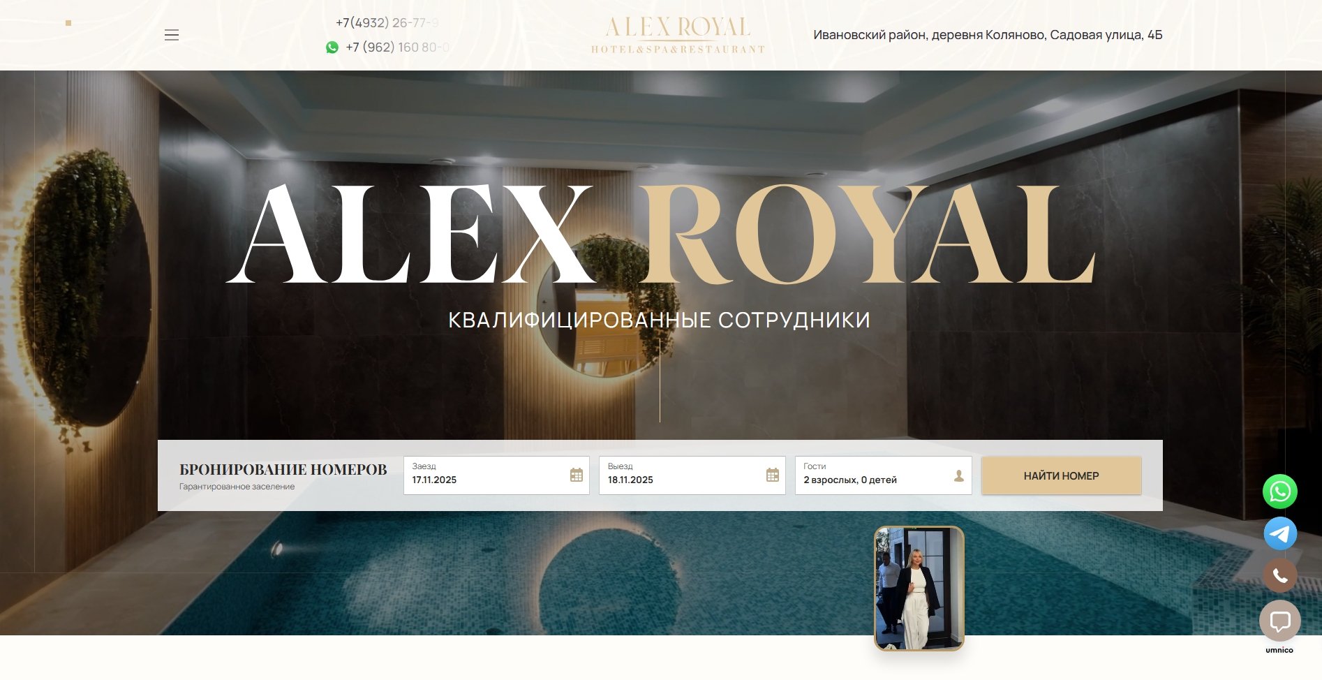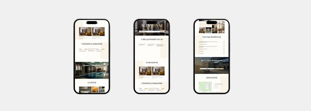 В итоге получился сайт, который не просто рассказывает об отеле — он переносит пользователя в атмосферу Alex Royal.