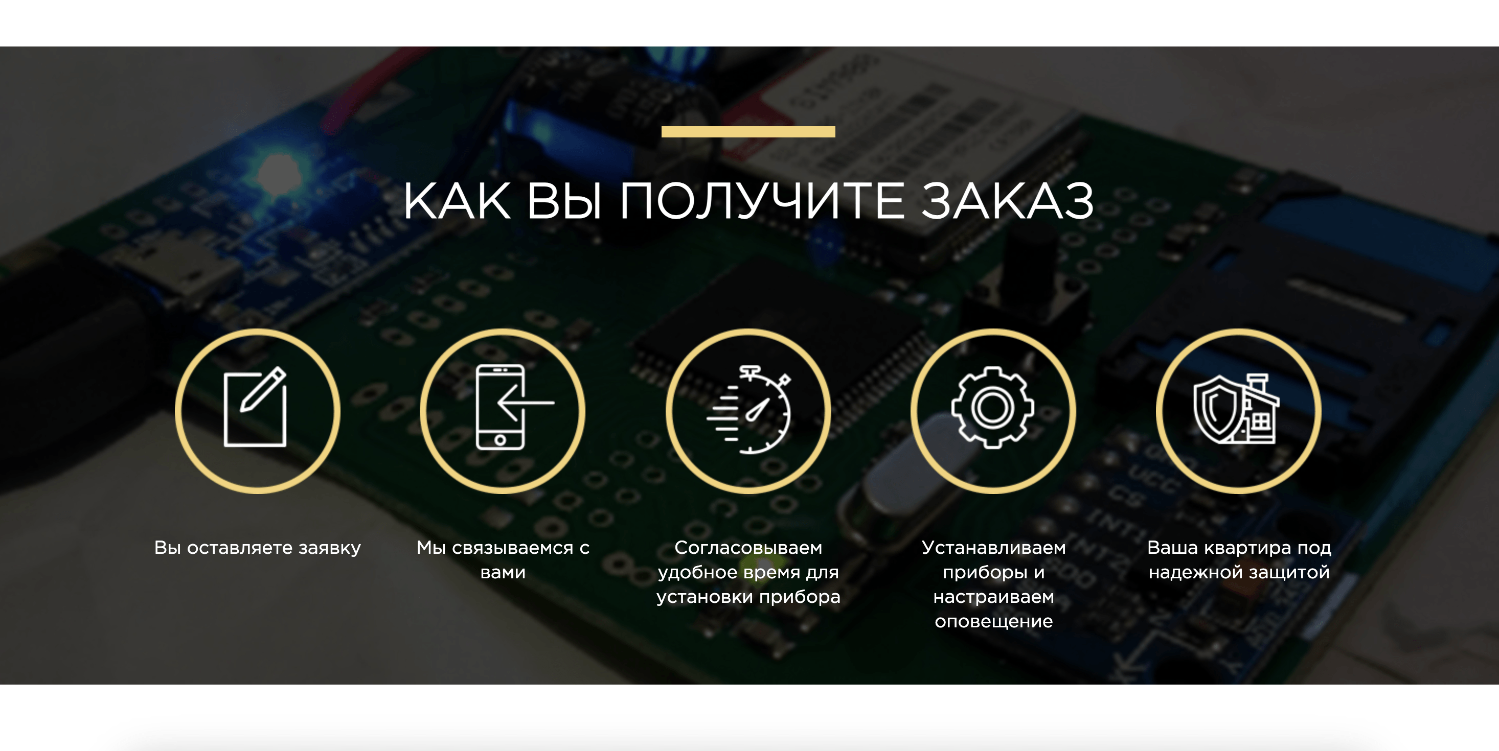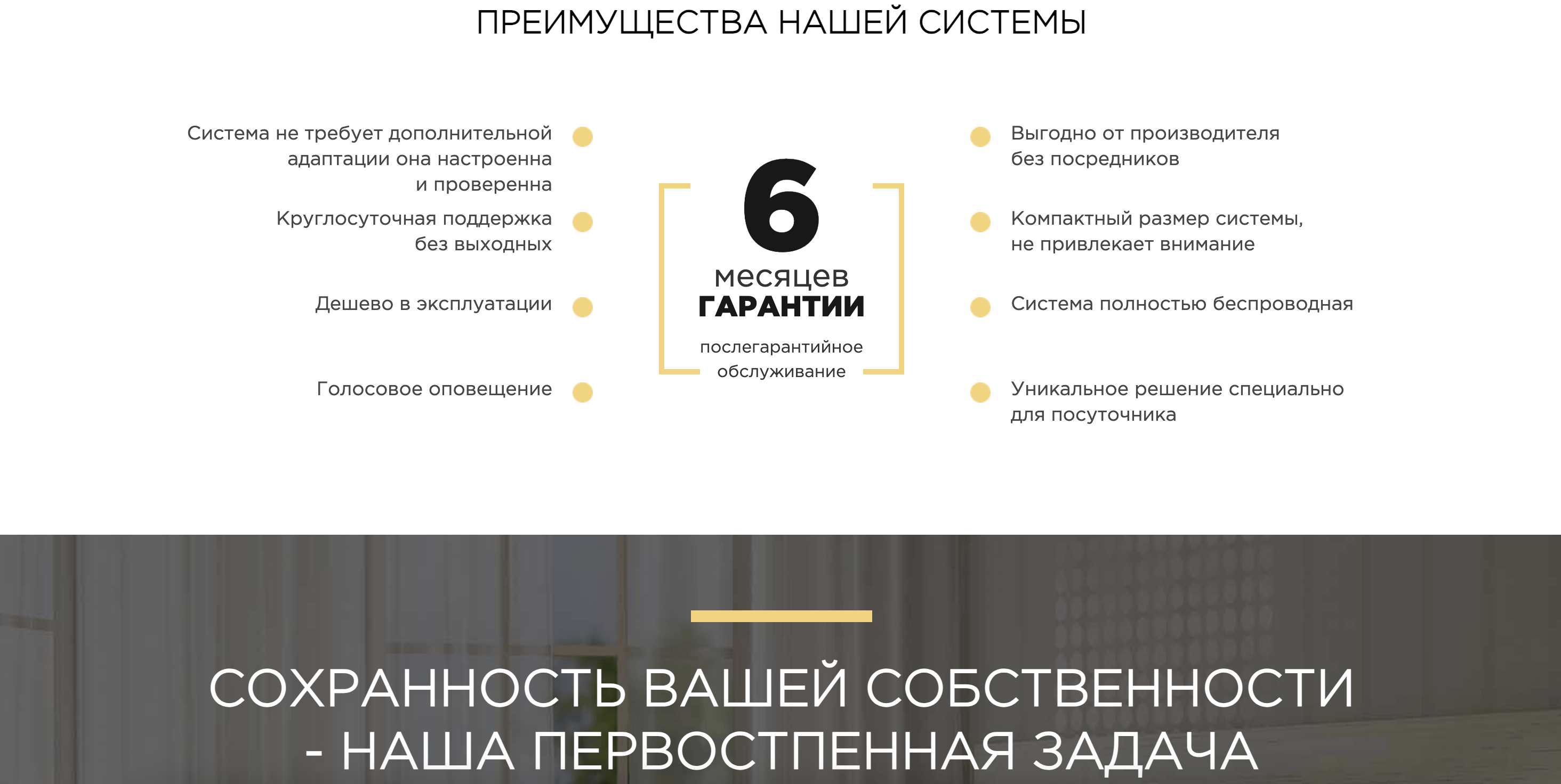 Выделили преимущества системы в инфографике: компактность, беспроводная установка, круглосуточная поддержка, гарантия, отсутствие ложных срабатываний.
