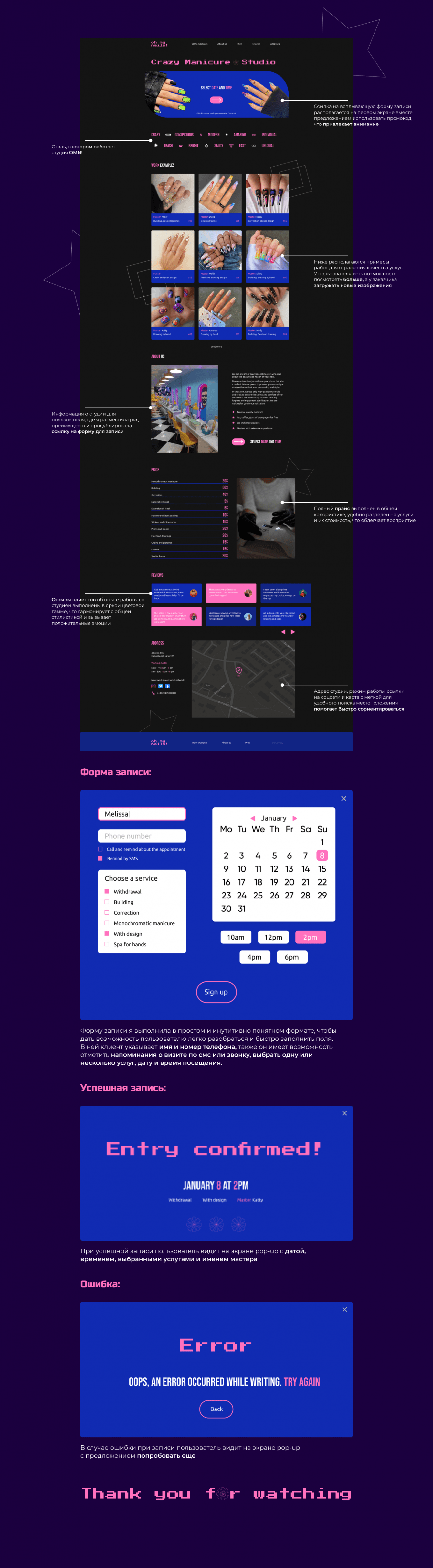 Создать лендинг для маникюрной студии, ориентированной на молодую аудиторию. Использовать темную цветовую гамму с яркими элементами. Необходимо обеспечить удобную навигацию, показать яркие фотографии работ, разместить прайс, а также предоставить возможность записи.