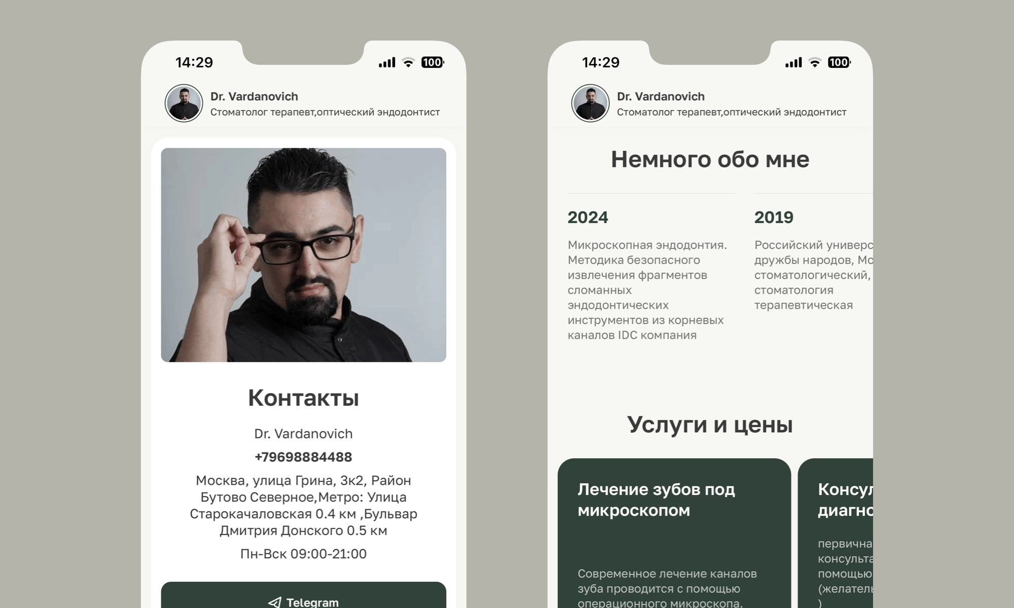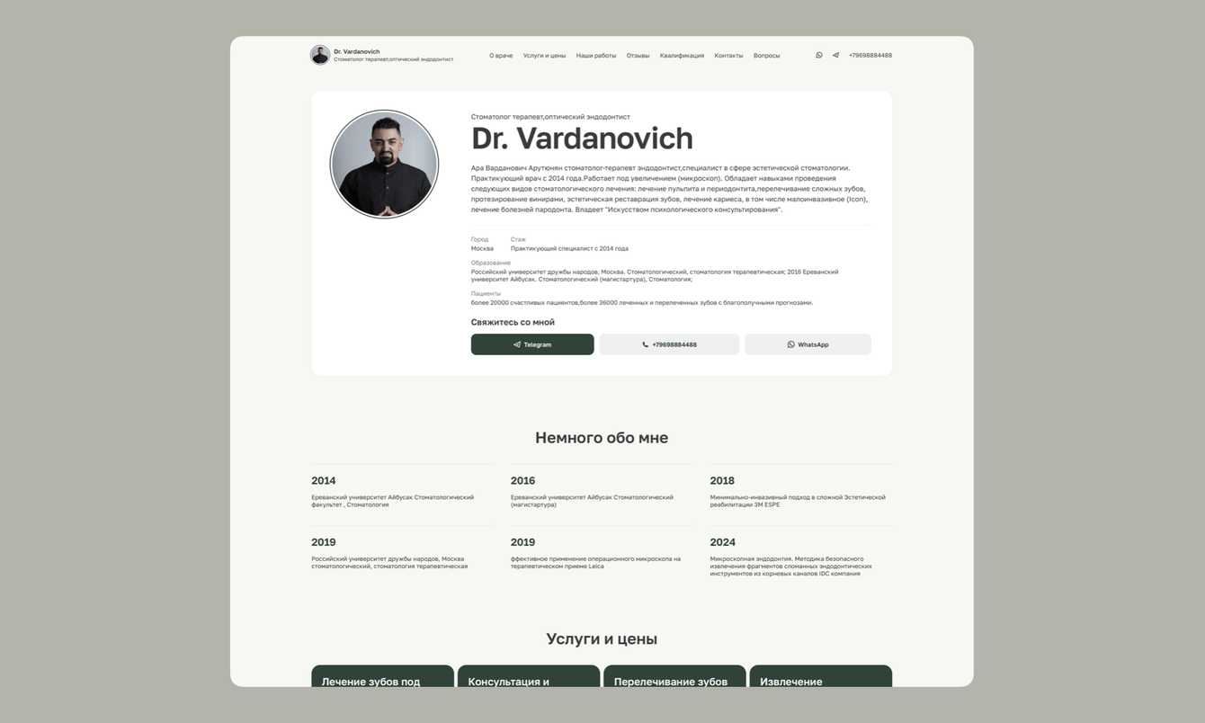 При создании сайта перед нами стояла задача не только показать услуги, но и создать пространство, где пациенты смогут легко ориентироваться и записываться на прием. Также важно было продемонстрировать высокий уровень профессионализма через каждый элемент интерфейса. Для этого был выбран подход, фокусирующийся на простоте, а также на функционале, который облегчает коммуникацию с пользователем.