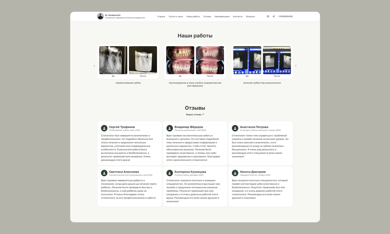 После запуска сайта количество онлайн-записей значительно возросло, а также наблюдается улучшение взаимодействия с пациентами. Сайт стал основным источником информации для новых клиентов, которые могут не только изучить услуги, но и ознакомиться с реальными результатами работы стоматолога через галерею до и после лечения. Это в свою очередь повысило уровень доверия к специалисту и привлекло больше пациентов.