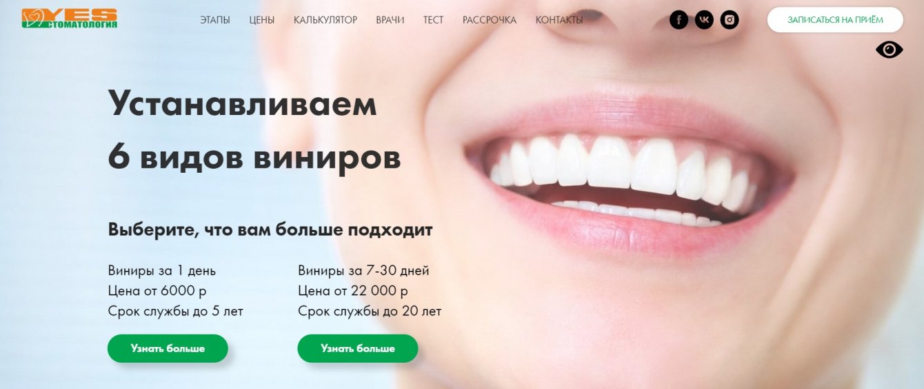 Стояла задача разработать лендинг под услугу "установка виниров и люминиров" под запуск трафика с Яндекс и социальных сетей