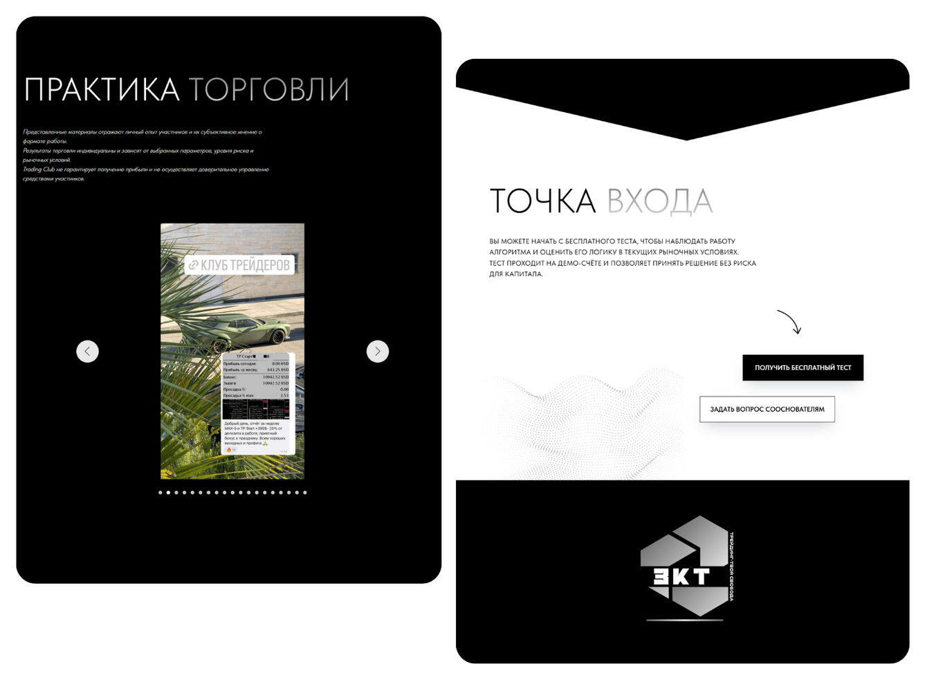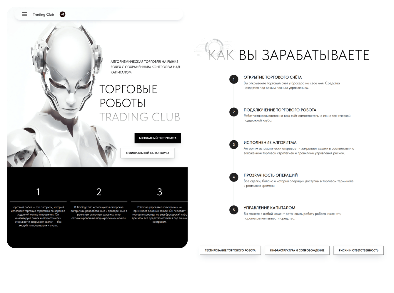 В рамках проекта был собран лендинг для сложного финансового продукта — торговых роботов и автоматизированной торговли. Основная задача заключалась не просто в визуальной сборке страницы, а в том, чтобы выстроить понятную структуру подачи, снизить недоверие к теме и последовательно подвести человека к целевому действию.