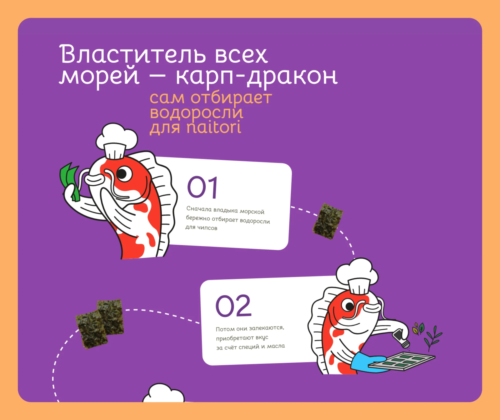 Отдельным блоком отработали возражение, что в чипсах может быть химия. В Tone of Voice решили ввести ещё одного персонажа для лендинга. Искали подходящий образ старшего мудреца, который лучше всех знает, как приготовить вкусный и полезный продукт. Изначально остановились на образе Нептуна: царь морей наверняка умеет отбирать качественные водоросли. Но на обсуждении с заказчиками пришли к тому, что задумка выбивается из корейской культуры. Поэтому остановились на карп-драконе из мифологии Азии. Кроме того, это популярный в последнее время образ для тату, что тоже популярно среди целевой аудитории.