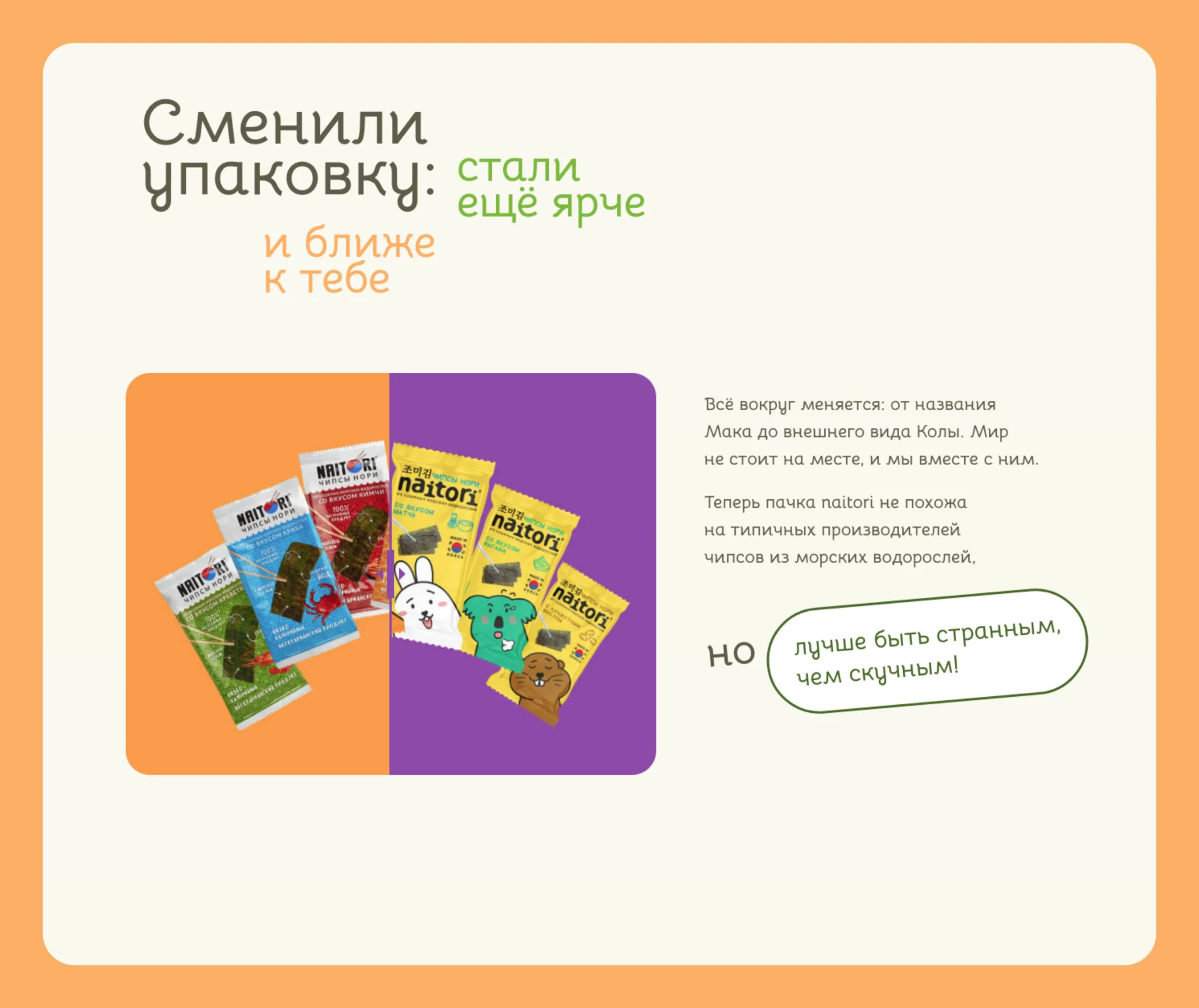 Всё началось с упаковки. Бренд naitori хотел выделиться среди чёрно-белых пакетов нори и бутылок соевых соусов. Именно в таких отделах супермаркетов обычно встречаются чипсы из водорослей. Компания решила провести ребрендинг здорового человека: исследовала целевую аудиторию и разработала новое позиционирование.