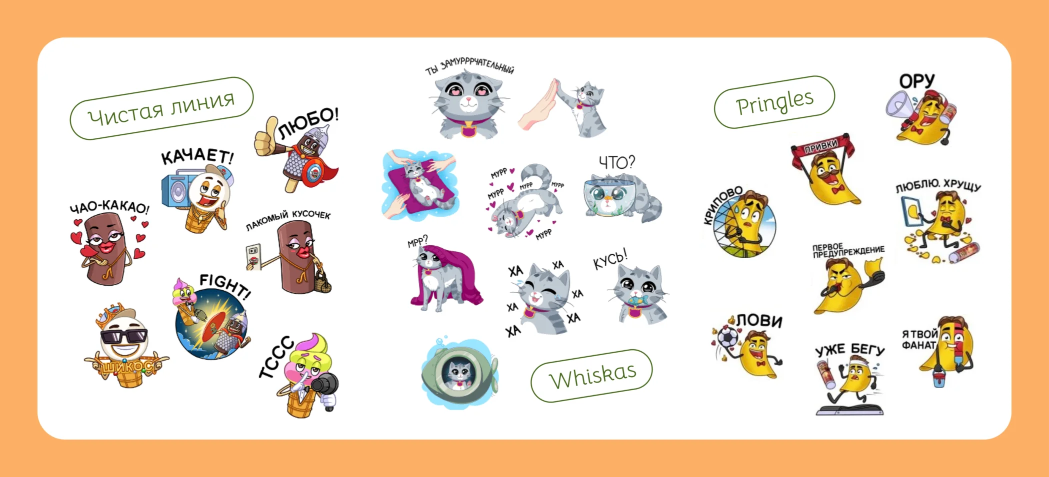 Мы впервые столкнулись с разработкой стикеров, но идея заказчикам понравилась сразу, поэтому мы приняли вызов. Конечно, начали с подбора референсов. Визуальный стиль по-умолчанию должен соответствовать персонажам на упаковке, поэтому копирайтер собрал примеры стикеров с точки зрения эмоций и смыслов.