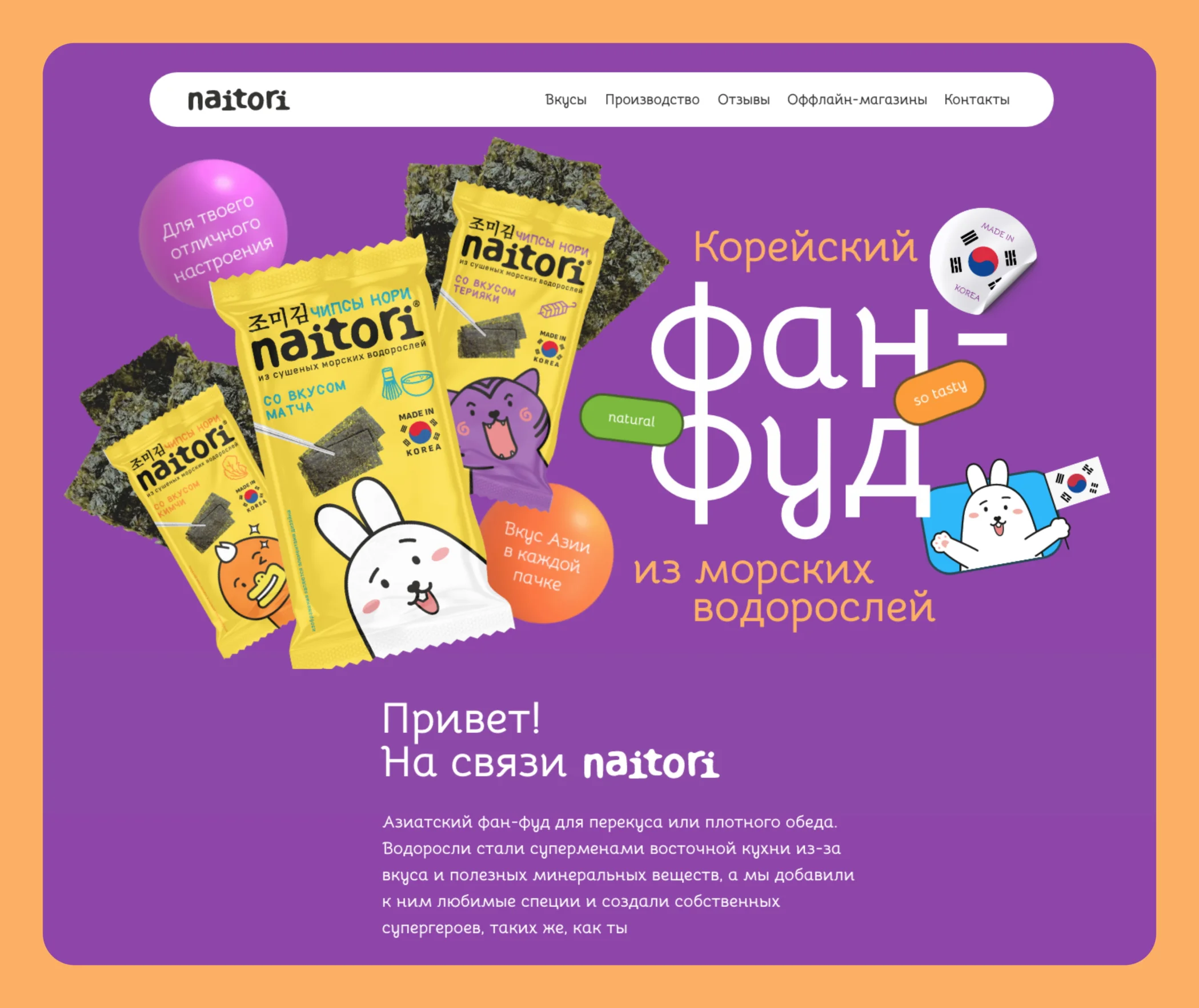 Вторым блоком перешли к вкусам чипсов, которые презентуют персонажи naitori. Наш иллюстратор отрисовал героев с упаковки и доработал их образы. У каждого появился свой жест или эмоция, которые дизайнер анимировал. Так получилось визуально оживить иллюстрации.