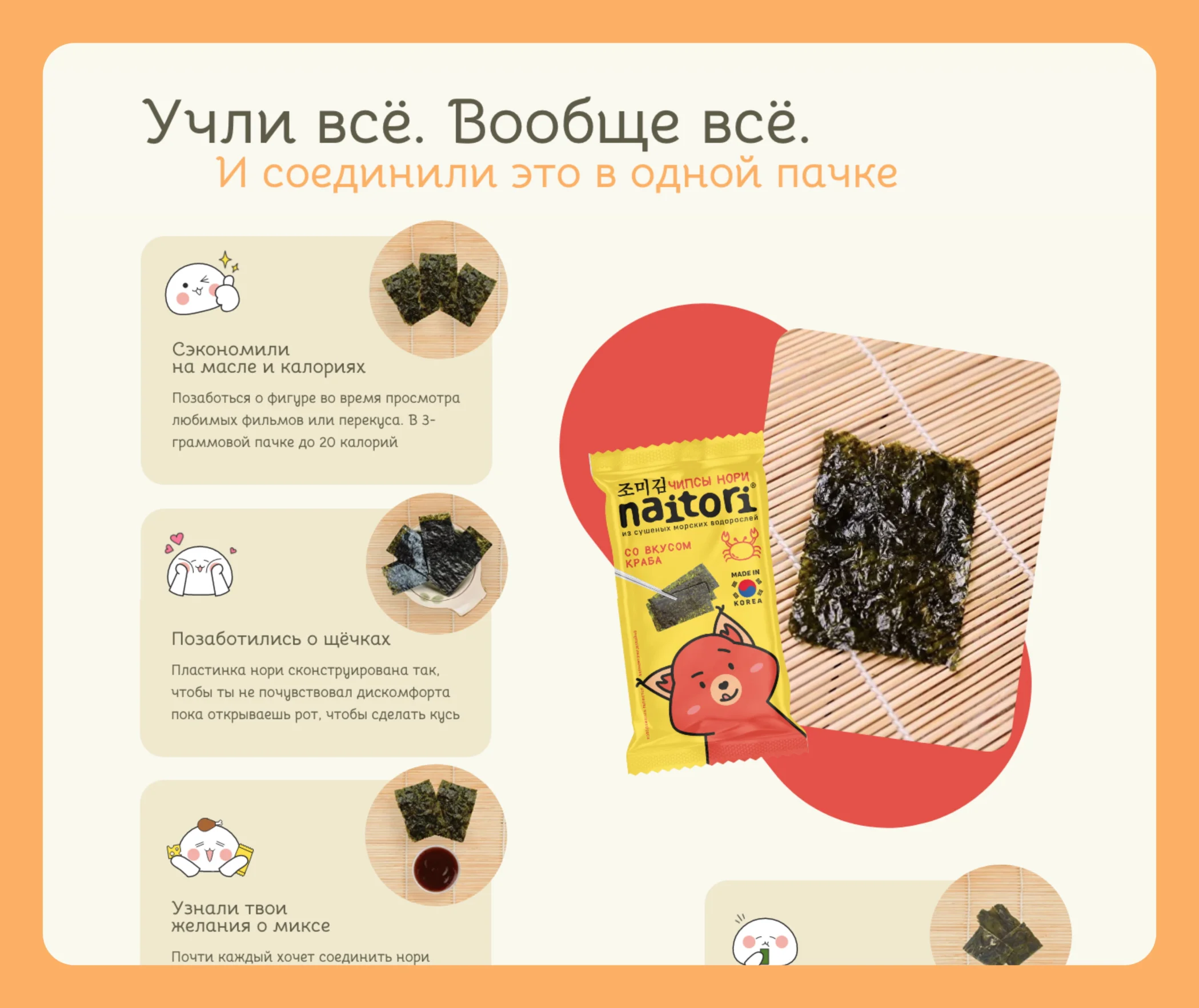 Сделали продуктовый блок с преимуществами, в котором подробнее донесли пользу, подробнее объяснили, чем чипсы отличаются от просто листов для роллов, рассказали про удобство миниатюрных лёгких пачек. Копирайтер преподнёс информацию в прикольных сравнениях и отсылках к мемам. Этот блок показывает, что продукт лучше продуман, в отличие от конкурентов. Например, обычно упаковка нори чипсов заполнена воздухом, и её невозможно положить в карман или маленькую сумочку, а naitori адаптирован, чтобы стать перекусом на бегу.