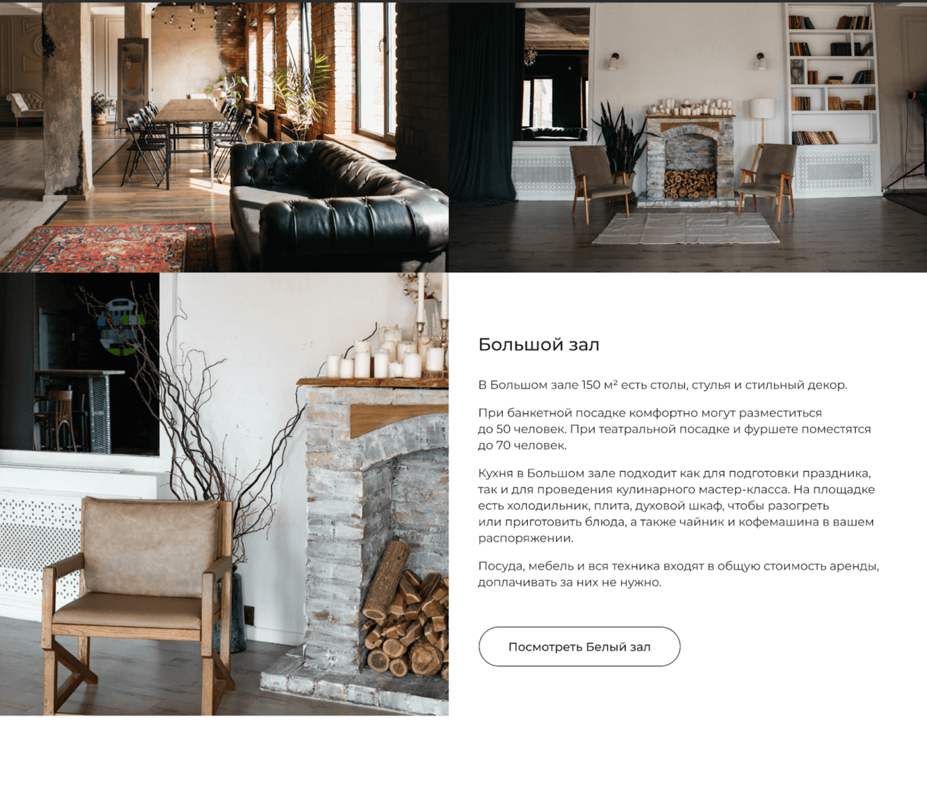 Показали красивые залы. Так как мы выяснили, что у клиента есть много отличных фотографий, которые он делал для Инстаграма (запрещен в России), мы решили их использовать на лендинге. Но была проблема: залы большие, техники и декора довольно много — а значит, чтобы все-все показать, нам надо было придумать, как подать фотографии и не перегрузить гостей.