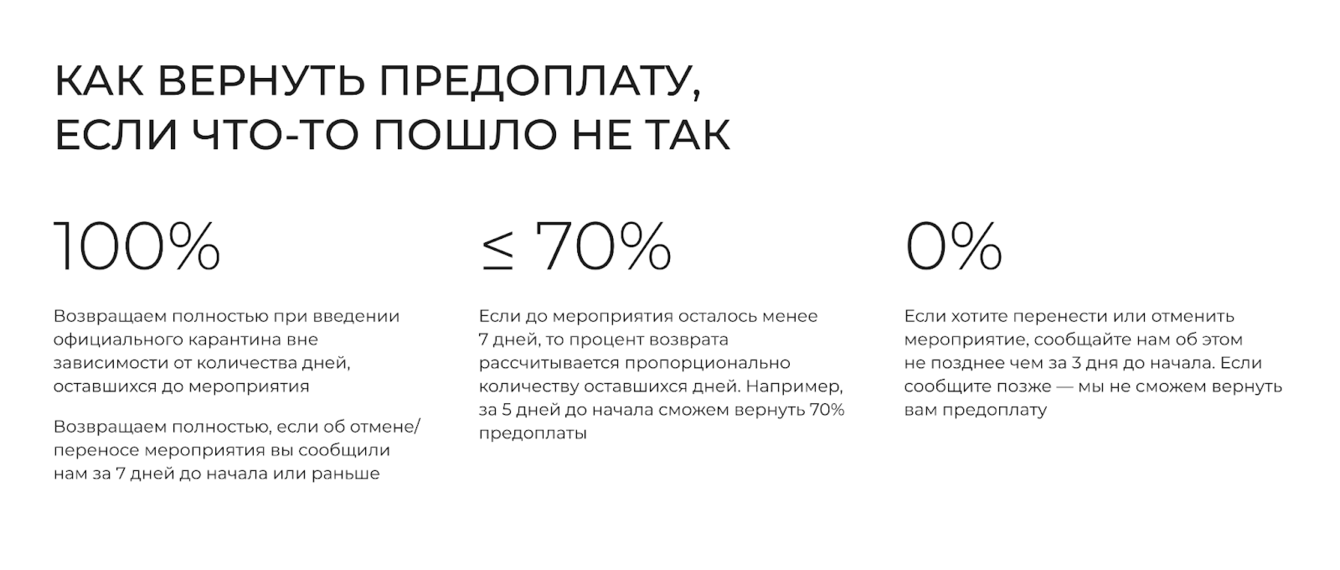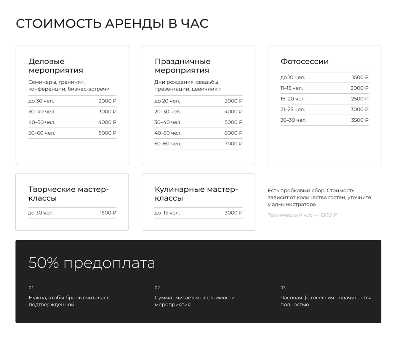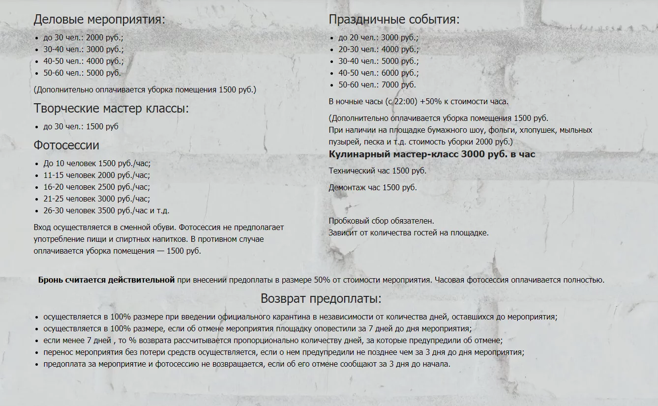 На старом сайте была проблема с ценами: под каждое мероприятие они разные, есть тонкости и определенный порядок возврата предоплаты. Во всем этом легко запутаться и в лучшем случае клиент просто потратит время на уточнения у администратора. В худшем — составит неверное понимание ценовой политики, а когда узнает, сколько реально он должен заплатить, то расстроится, оставит гневный отзыв и никогда не порекомендует помещение клиента своим друзьям.