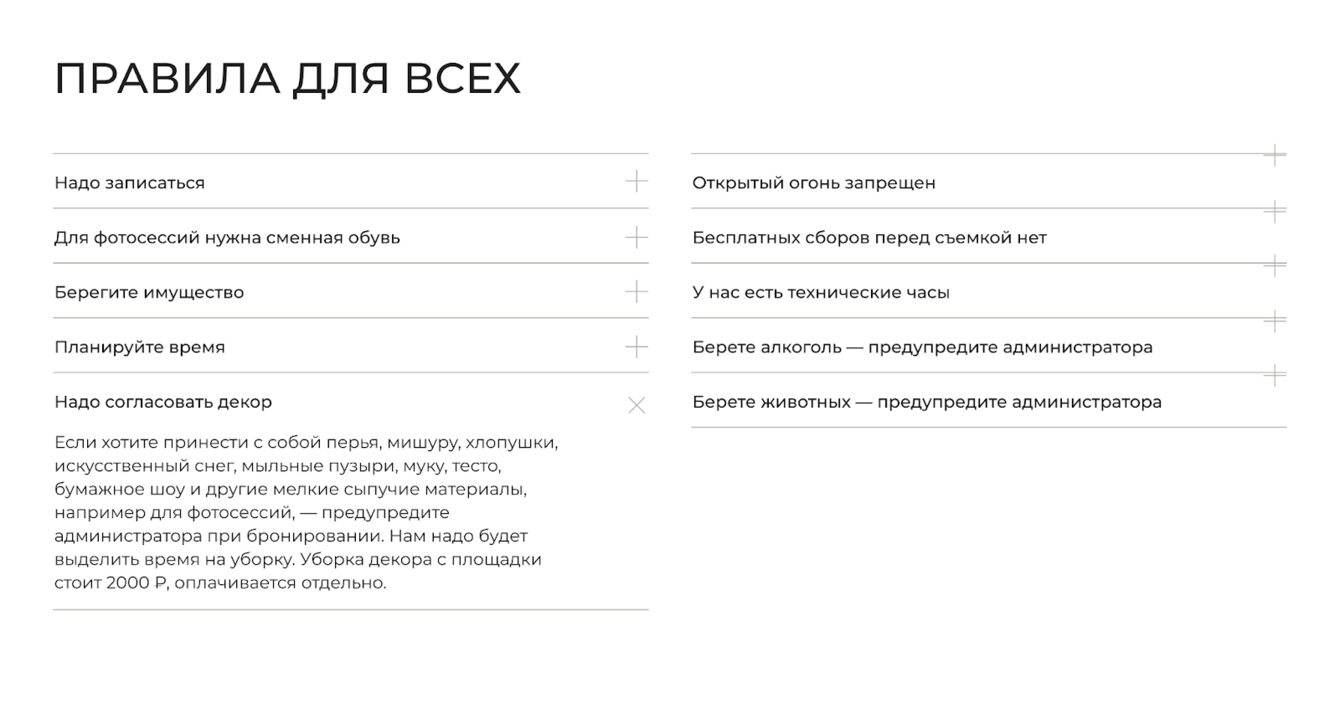 С правилами для гостей поступили точно так же: чтобы не вываливать на людей кучу текста, мы сгруппировали правила и переписали их, чтобы упростить понимание. Отображение сделали в виде удобных карточек, которые раскрываются при наведении курсора.